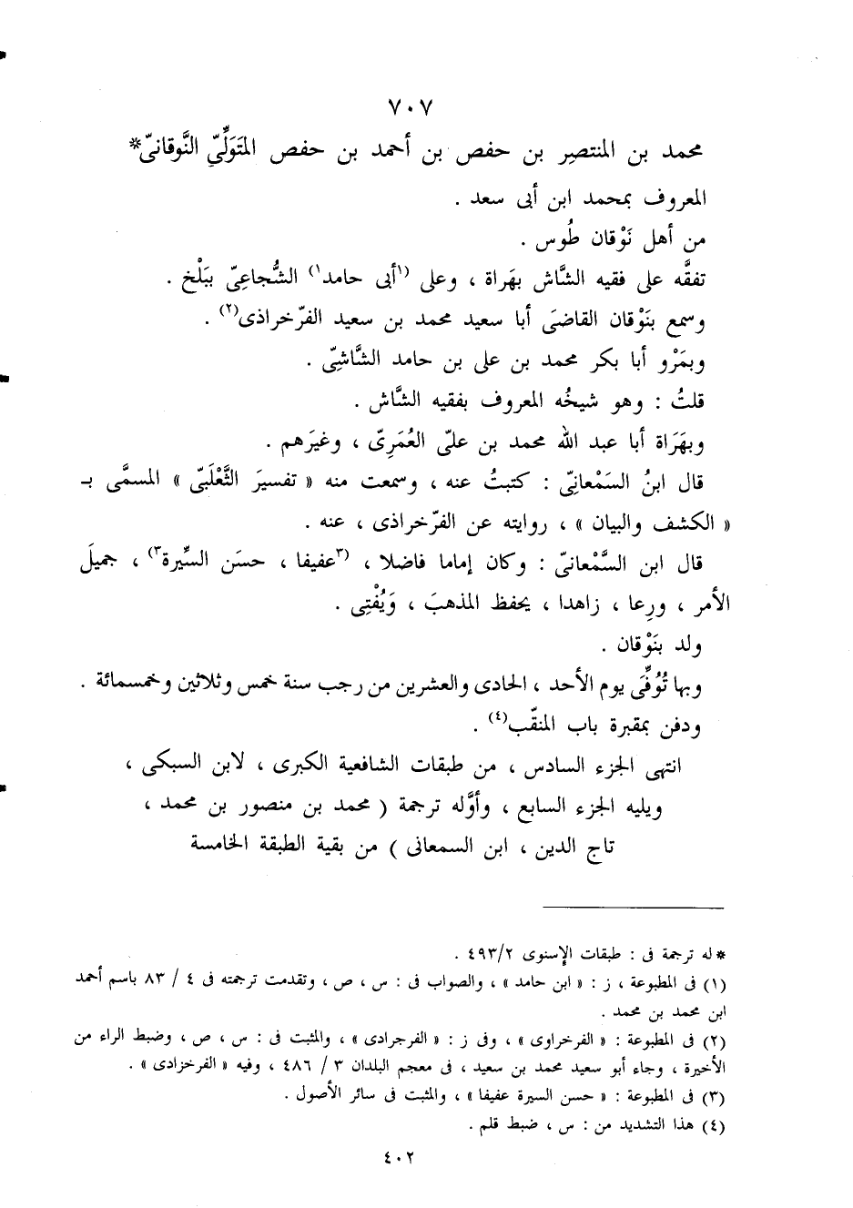 انْتهى الْجُزْء السَّادِس من طَبَقَات الشَّافِعِيَّة الْكُبْرَى لِابْنِ السُّبْكِيّ ويليه الْجُزْء السَّابِع وأوله تَرْجَمَة مُحَمَّد بن مَنْصُور مُحَمَّد تَاج الدّين ابْن السَّمْعَانِيّ من بَقِيَّة الطَّبَقَة الْخَامِس