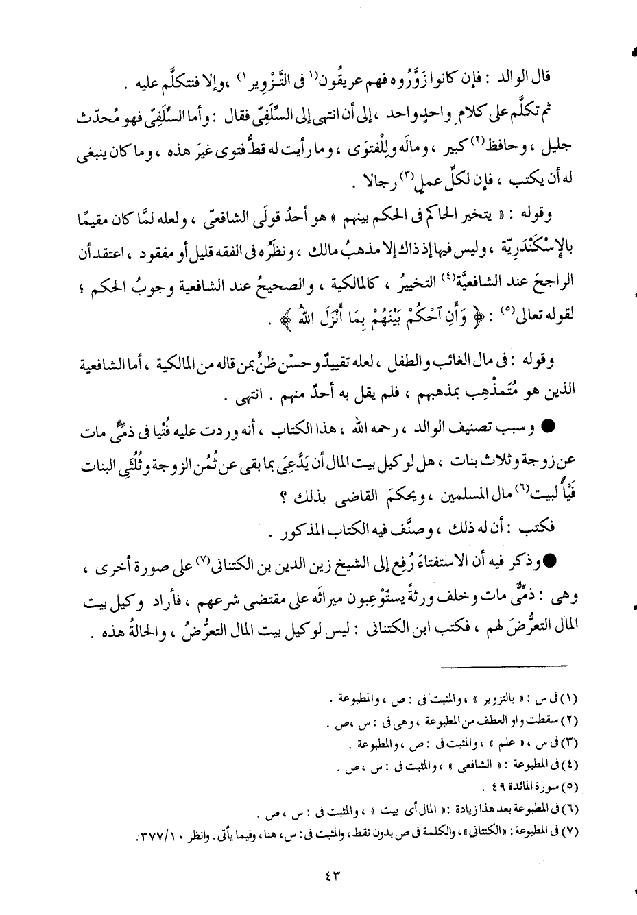 انْتهى وَسبب تصنيف الْوَالِد رَحمَه الله هَذَا الْكتاب أَنه وَردت عَلَيْهِ فتيا فِي ذمى مَاتَ عَن زَوْجَة وَثَلَاث بَنَات هَل لوكيل بَيت المَال أَن يَدعِي بِمَا يقي عَن ثمن الزَّوْجَة وثلثي الْبَنَات فيأ لبيت مَال الْمُسلمين وَيحكم القَاضِي بذلك