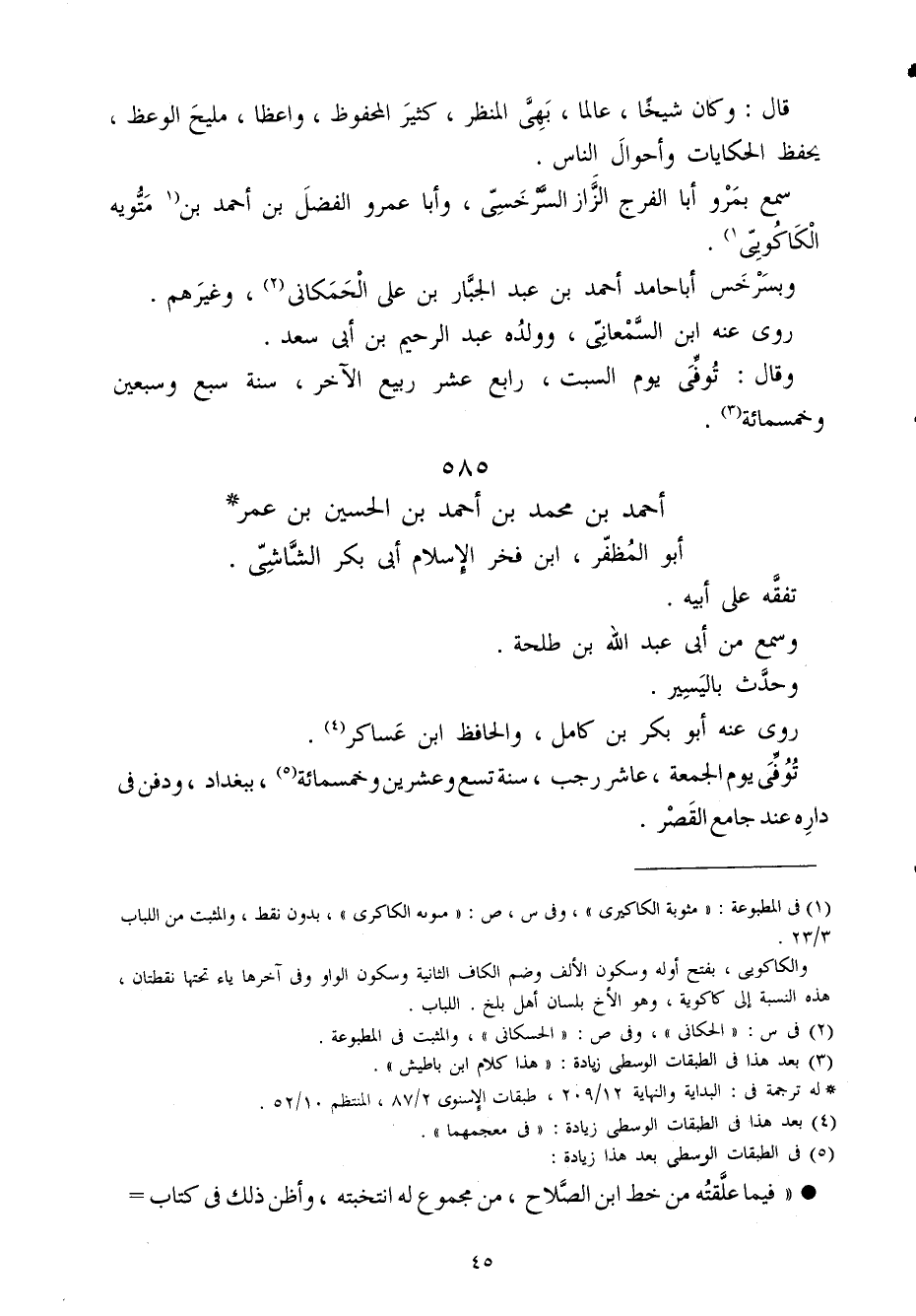 585 - أَحْمد بن مُحَمَّد بن أَحْمد بن الْحُسَيْن بن عمر أَبُو المظفر ابْن فَخر الْإِسْلَام أبي بكر الشَّاشِي
