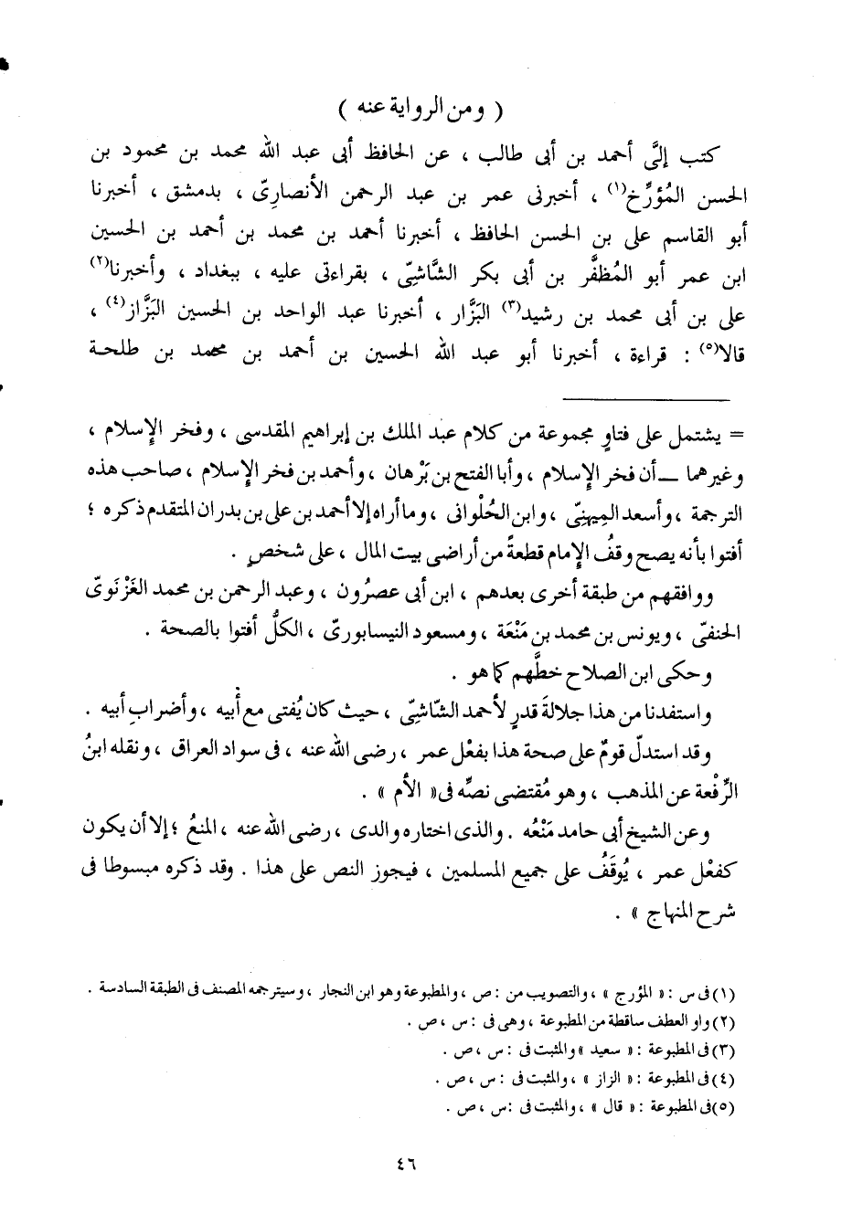 كتب إِلَى أَحْمد بن أبي طَالب عَن الْحَافِظ أبي عبد الله مُحَمَّد بن مَحْمُود بن الْحسن المؤرخ أَخْبرنِي عمر بن عبد الرَّحْمَن الْأنْصَارِيّ بِدِمَشْق أخبرنَا أَبُو الْقَاسِم عَليّ بن الْحسن الْحَافِظ أخبرنَا أَحْمد بن مُحَمَّد بن أَحْمد بن الْحُسَيْن ابْن عمر أَبُو المظفر بن أبي بكر الشَّاشِي بِقِرَاءَتِي عَلَيْهِ بِبَغْدَاد وَأخْبرنَا عَليّ بن أبي مُحَمَّد بن رشيد الْبَزَّار أخبرنَا عبد الْوَاحِد بن الْحُسَيْن الْبَزَّاز قَالَا قِرَاءَة أخبرنَا أَبُو عبد الله الْحُسَيْن بن أَحْمد بن مُحَمَّد بن طَلْحَة