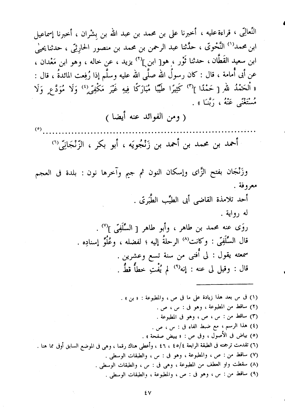 النعالي قِرَاءَة عَلَيْهِ أخبرنَا عَليّ بن مُحَمَّد بن عبد الله بن بَشرَان أخبرنَا إِسْمَاعِيل ابْن مُحَمَّد النَّحْوِيّ حَدثنَا عبد الرَّحْمَن بن مُحَمَّد بن مَنْصُور الْحَارِثِيّ حَدثنَا يحيى ابْن سعيد الْقطَّان حَدثنَا ثَوْر هُوَ ابْن يزِيد عَن خَاله وَهُوَ ابْن معدان عَن أبي أُمَامَة قَالَ كَانَ رَسُول الله صلى الله عَلَيْهِ وَسلم إِذا رفعت الْمَائِدَة قَالَ (الْحَمد لله حمدا كثيرا طيبا مُبَارَكًا فِيهِ غير مكفى وَلَا مُودع وَلَا مستغني عَنهُ رَبنَا)