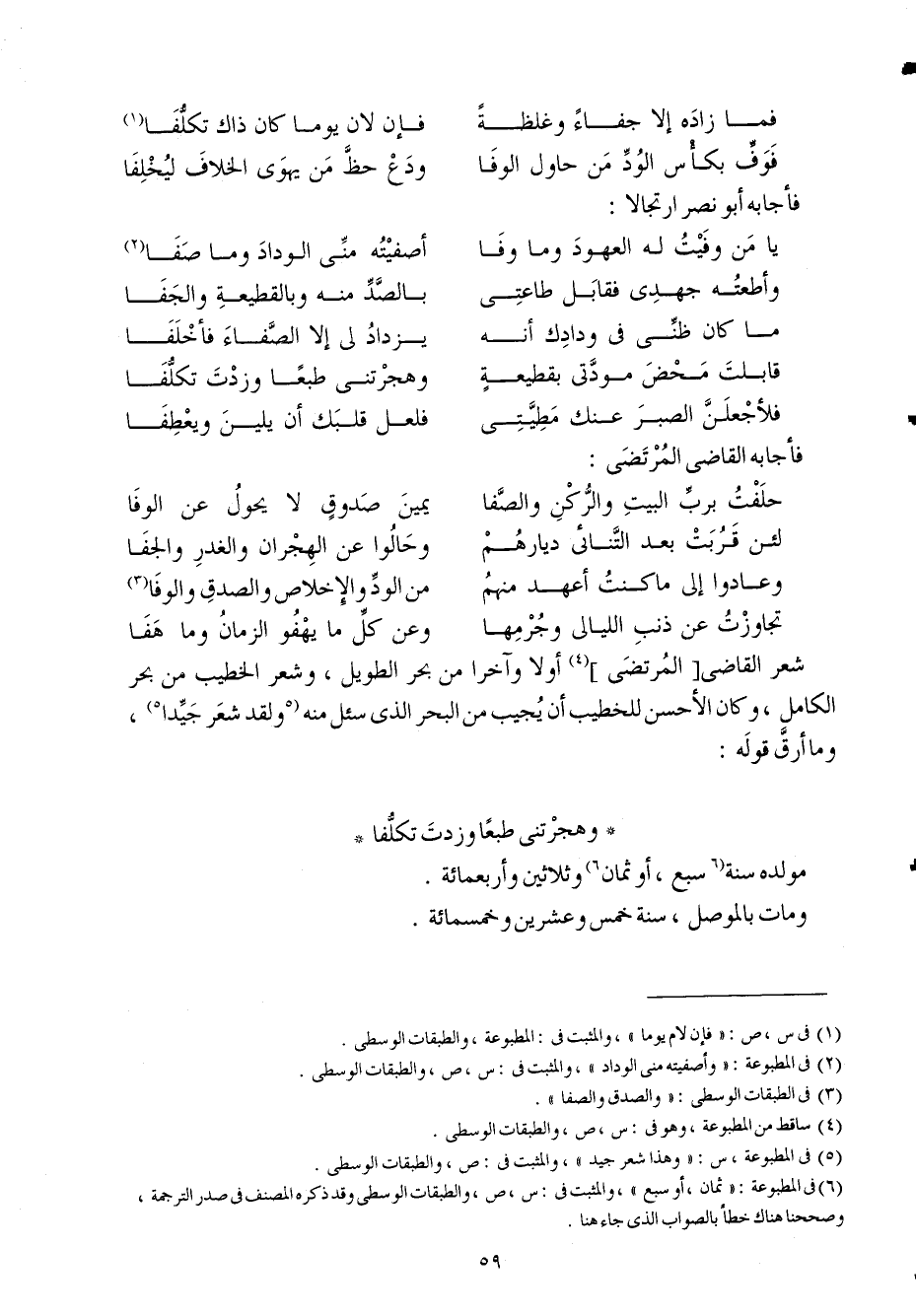 شعر القَاضِي المرتضى أَولا وآخرا من بَحر الطَّوِيل وَشعر الْخَطِيب من بَحر الْكَامِل وَكَانَ الْأَحْسَن للخطيب أَن يُجيب من الْبَحْر الَّذِي سُئِلَ مِنْهُ وَلَقَد شعر جيدا وَمَا أرق قَوْله