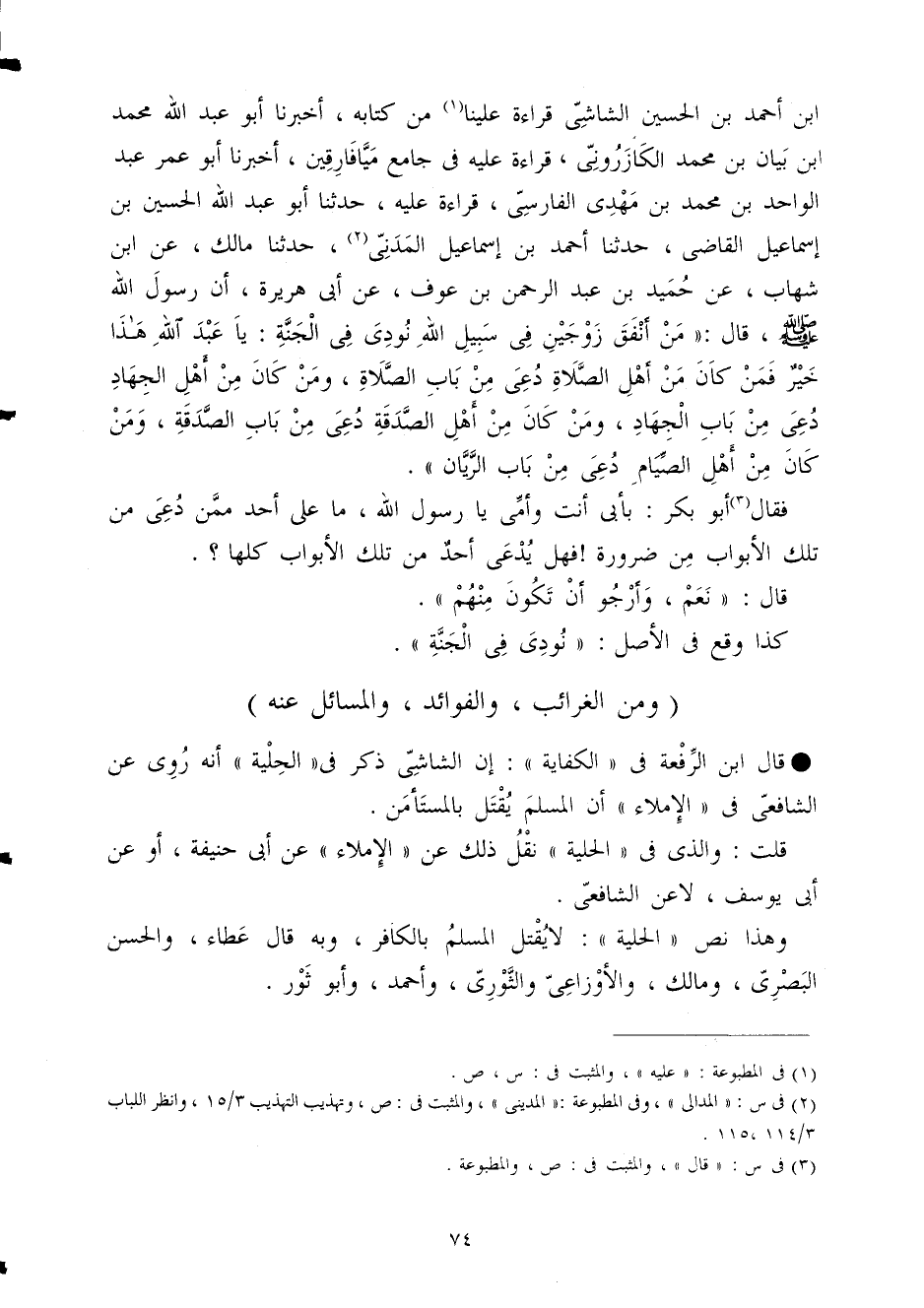 ابْن أَحْمد بن الْحُسَيْن الشَّاشِي قِرَاءَة علينا من كِتَابه أخبرنَا أَبُو عبد الله مُحَمَّد ابْن بَيَان بن مُحَمَّد الكازروني قِرَاءَة عَلَيْهِ فِي جَامع ميافارقين أخبرنَا أَبُو عمر عبد الْوَاحِد بن مُحَمَّد بن مهْدي الْفَارِسِي قِرَاءَة عَلَيْهِ حَدثنَا أَبُو عبد الله الْحُسَيْن بن إِسْمَاعِيل القَاضِي حَدثنَا أَحْمد بن إِسْمَاعِيل الْمدنِي حَدثنَا مَالك عَن ابْن شهَاب عَن حميد بن عبد الرَّحْمَن بن عَوْف عَن أبي هُرَيْرَة أَن رَسُول الله صلى الله عَلَيْهِ وَسلم قَالَ (من أنْفق زَوْجَيْنِ فِي سَبِيل الله نُودي فِي الْجنَّة يَا عبد الله هَذَا خير فَمن كَانَ من أهل الصَّلَاة دعِي من بَاب الصَّلَاة وَمن كَانَ من أهل الْجِهَاد دعِي من بَاب الْجِهَاد وَمن كَانَ من أهل الصَّدَقَة دعِي من بَاب الصَّدَقَة وَمن كَانَ من أهل الصّيام دعِي من بَاب الريان)