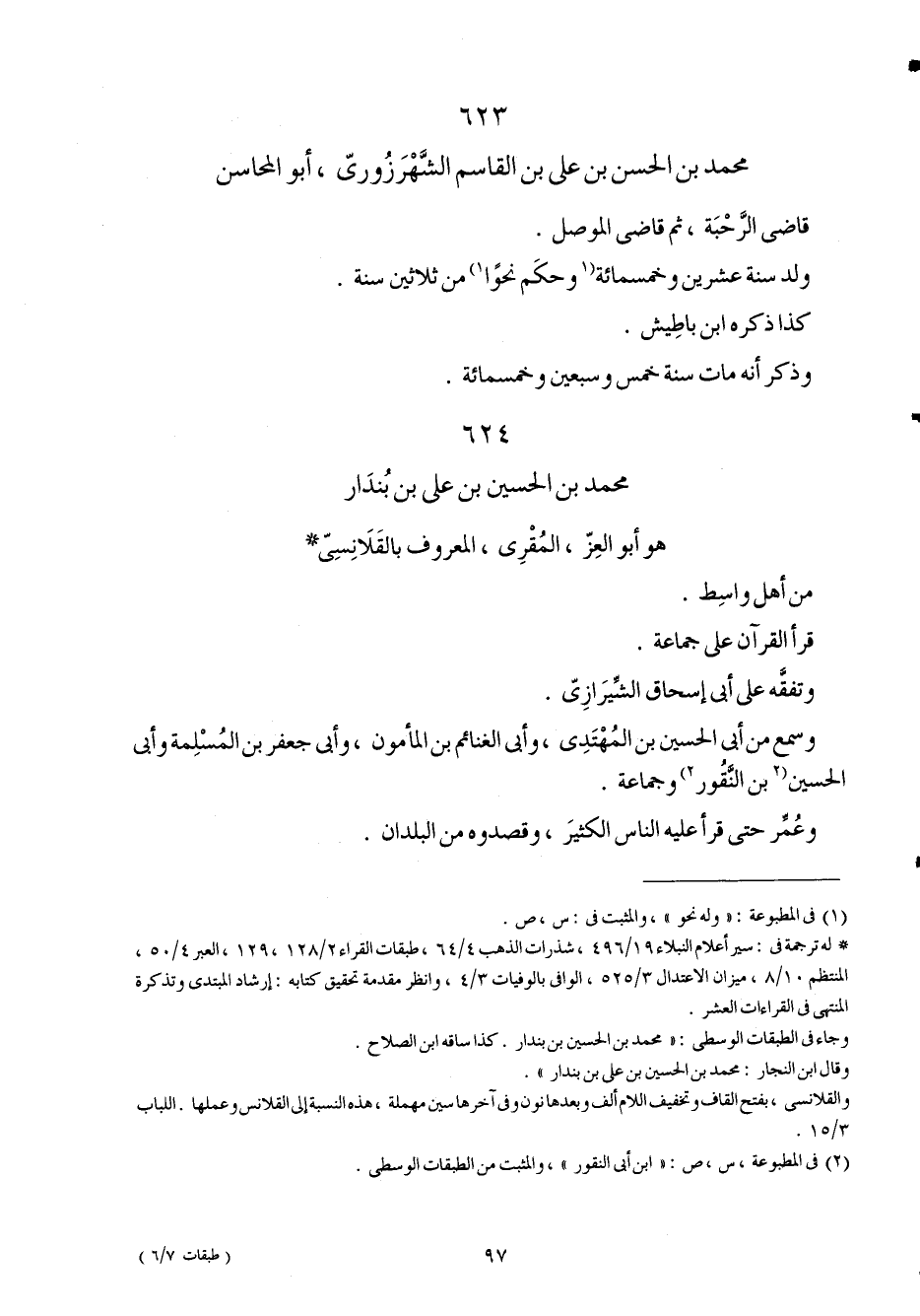 624 - مُحَمَّد بن الْحُسَيْن بن عَليّ بن بنْدَار هُوَ أَبُو الْعِزّ الْمقري الْمَعْرُوف بالقلانسي