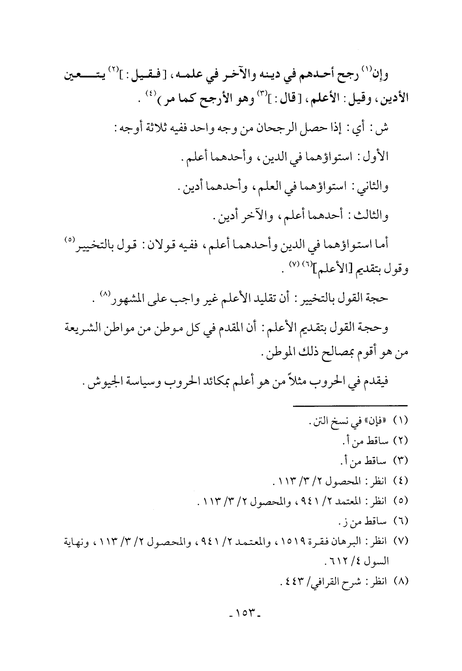 وإِن (١) رجح أحدهم في دينه والآخر في علمه، [فقيل:] (٢) يتعين الأدين، وقيل: الأعلم، [قال:] (٣) وهو الأرجح كما مر) (٤).
