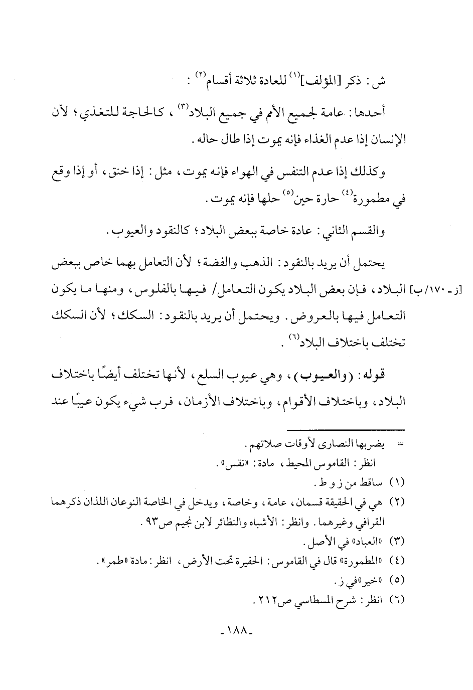 والقسم الثاني: عادة خاصة ببعض البلاد؛ كالنقود والعيوب.