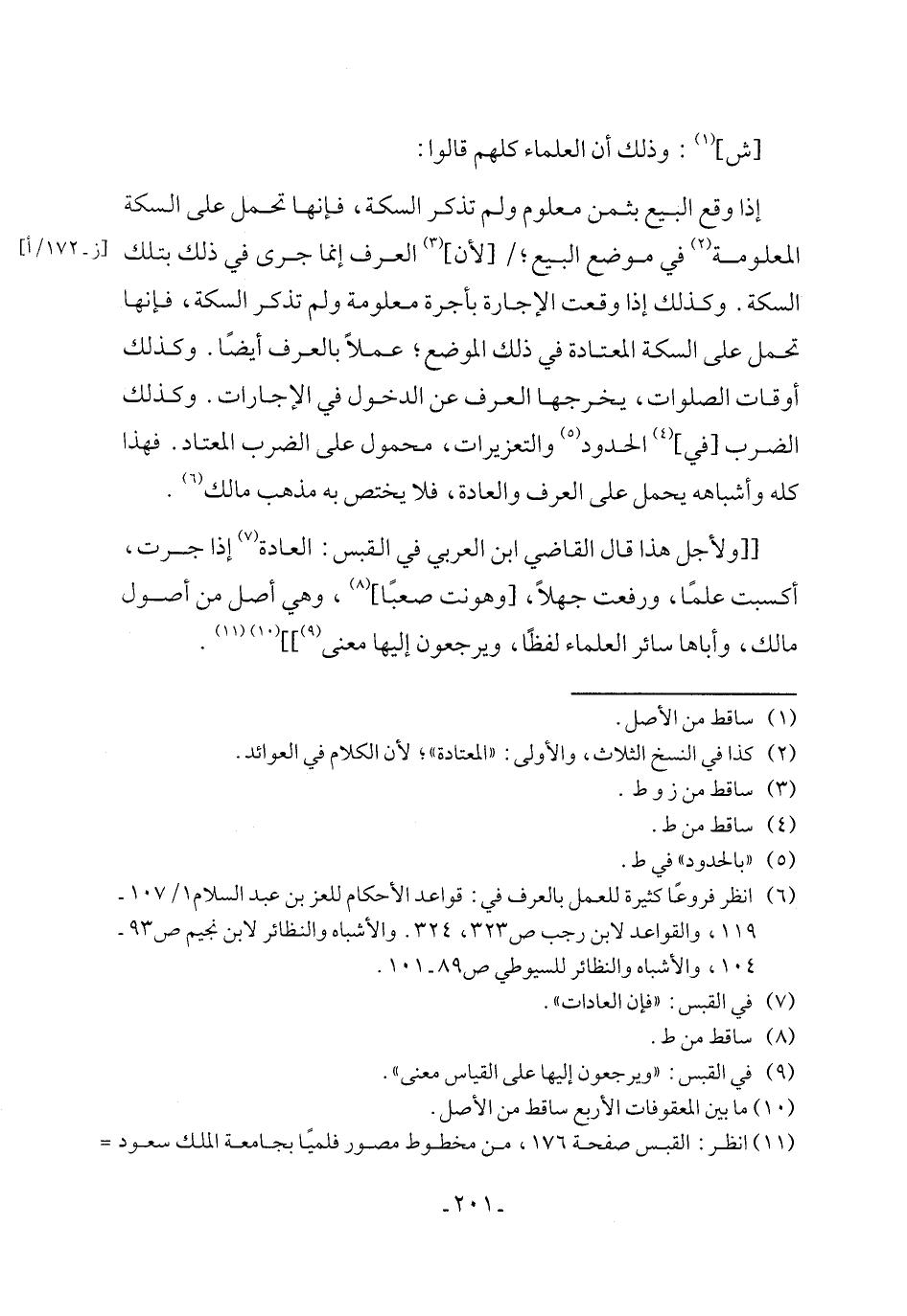 إذا وقع البيع بثمن معلوم ولم تذكر السكة، فإنها تحمل على السكة المعلومة (٢) في موضع البيع؛ [لأن] (٣) العرف إنما جرى في ذلك بتلك السكة. وكذلك إذا وقعت الإجارة بأجرة معلومة ولم تذكر السكة، فإنها تحمل على السكة المعتادة في ذلك الموضع؛ عملًا بالعرف أيضًا. وكذلك أوقات الصلوات، يخرجها العرف عن الدخول في الإجارات. وكذلك الضرب [في] (٤) الحدود (٥) والتعزيرات، محمول على الضرب المعتاد. فهذا كله وأشباهه يحمل على العرف والعادة، فلا يختص به مذهب مالك (٦).