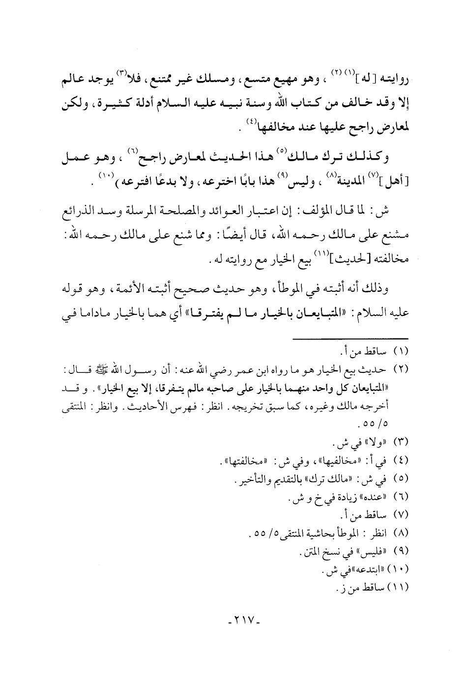ش: لما قال المؤلف: إن اعتبار العوائد والمصلحة المرسلة وسد الذرائع مشنع على مالك رحمه الله، قال أيضًا: ومما شنع على مالك رحمه الله: مخالفته [لحديث] (١١) بيع الخيار مع روايته له.