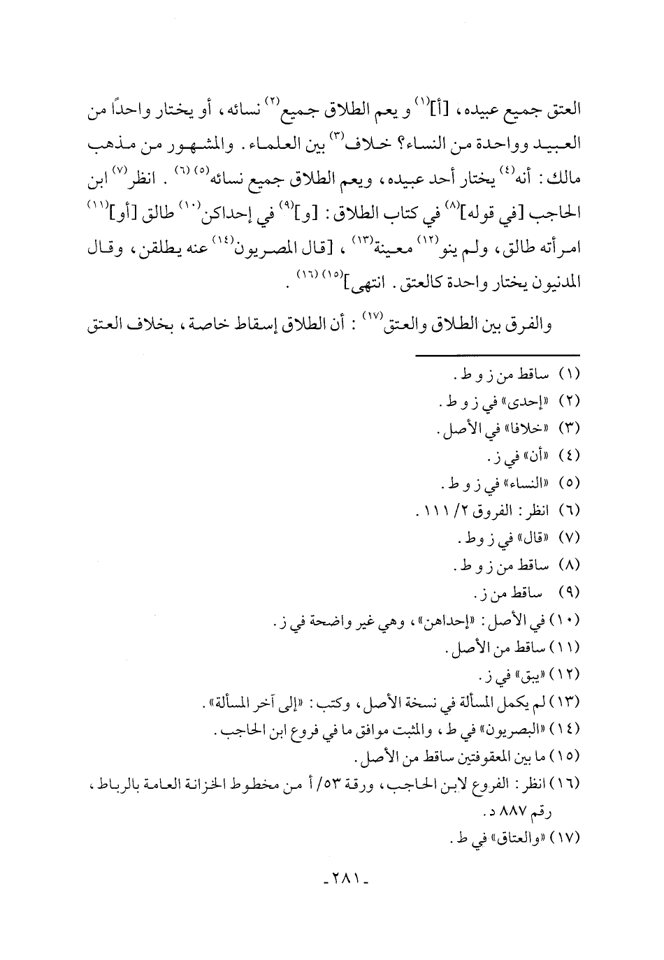 العتق جميع عبيده، [أ] (١) ويعم الطلاق جميع (٢) نسائه، أو يختار واحدًا من العبيد وواحدة من النساء؟ خلاف (٣) بين العلماء. والمشهور من مذهب مالك: أنه (٤) يختار أحد عبيده، ويعم الطلاق جميع نسائه (٥) (٦). انظر (٧) ابن الحاجب [في قوله] (٨) في كتاب الطلاق: [و] (٩) في إحداكن (١٠) طالق [أو] (١١) امرأته طالق، ولم ينو (١٢) معينة (١٣)، [قال المصريون (١٤) عنه يطلقن، وقال المدنيون يختار واحدة كالعتق. انتهى] (١٥) (١٦).