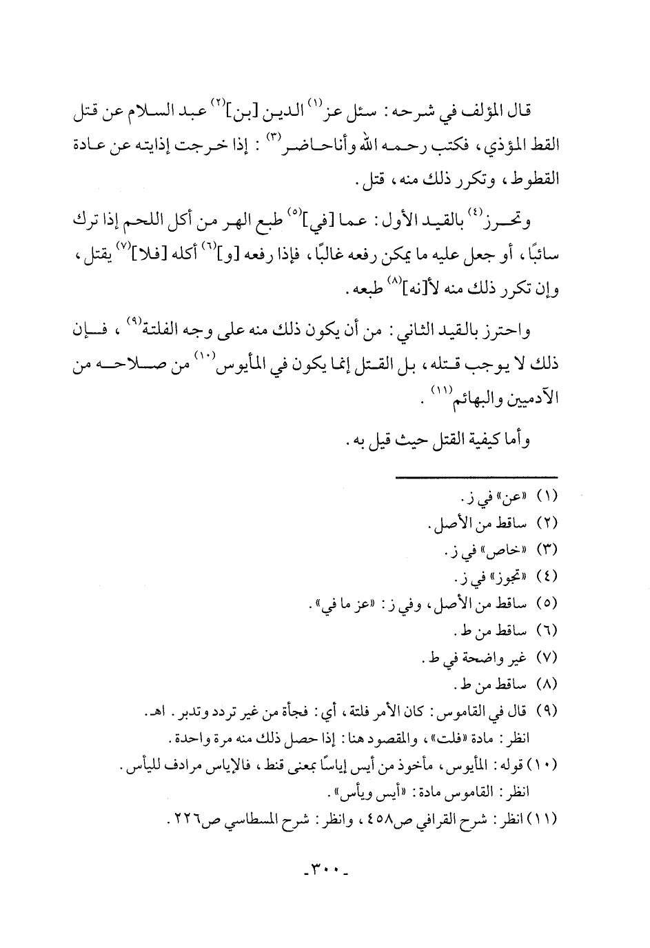 قال المؤلف في شرحه: سئل عز (١) الدين [بن] (٢) عبد السلام عن قتل القط المؤذي، فكتب رحمه الله وأنا حاضر (٣): إذا خرجت إذايته عن عادة القطوط، وتكرر ذلك منه، قتل.