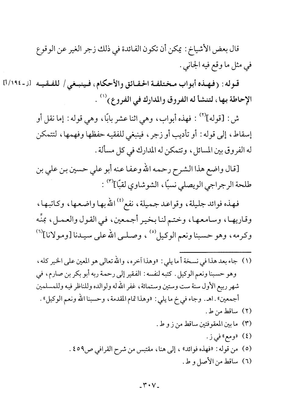 (٥) من قوله: "فهذه فوائد"، إلى هنا، مقتبس من شرح القرافي ص ٤٥٩.