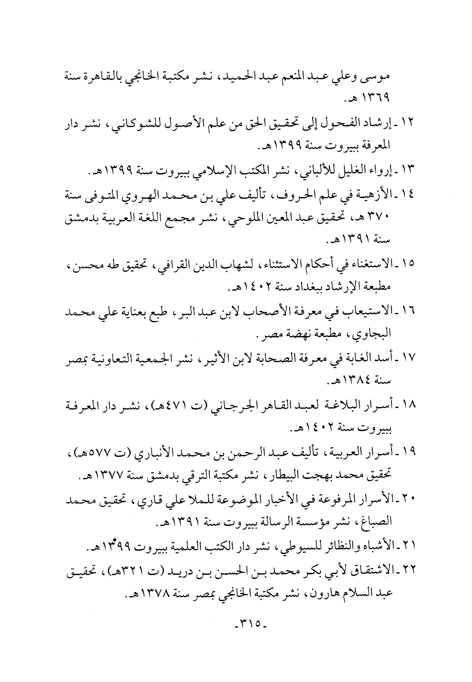 ١٤ - الأزهية في علم الحروف، تأليف علي بن محمد الهروي المتوفى سنة ٣٧٠ هـ، تحقيق عبد المعين الملوحي، نشر مجمع اللغة العربية بدمشق سنة ١٣٩١ هـ.