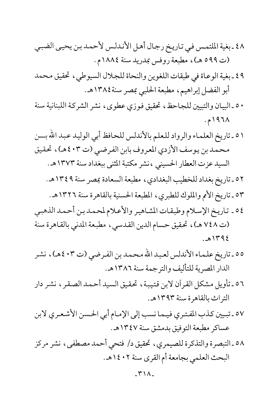 ٥١ - تاريخ العلماء والرواد للعلم بالأندلس للحافظ أبي الوليد عبد الله بن محمد بن يوسف الأزدي المعروف بابن الفرضي (ت ٤٠٣ هـ)، تحقيق السيد عزت العطار الحسيني، نشر مكتبة المثنى ببغداد سنة ١٣٧٣ هـ.