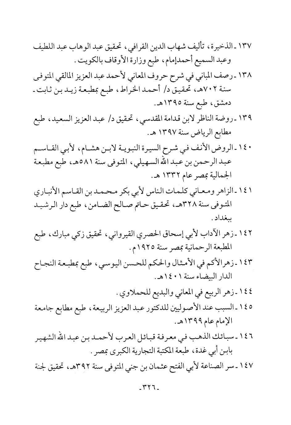 ١٣٧ - الذخيرة، تأليف شهاب الدين القرافي، تحقيق عبد الوهاب عبد اللطيف وعبد السميع أحمد إمام، طبع وزارة الأوقاف بالكويت.