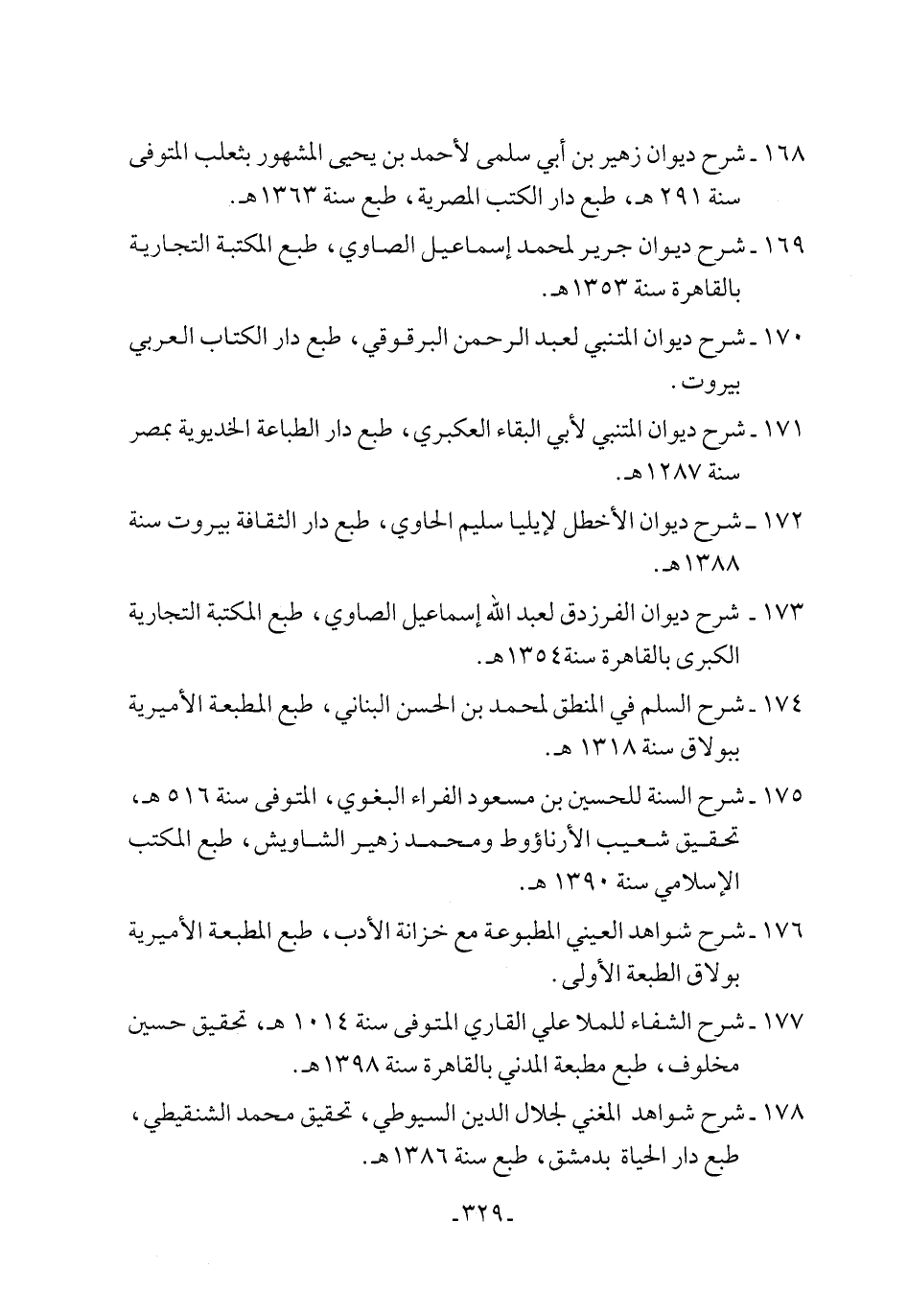 ١٦٩ - شرح ديوان جرير لمحمد إسماعيل الصاوي، طبع المكتبة التجارية بالقاهرة سنة ١٣٥٣ هـ.