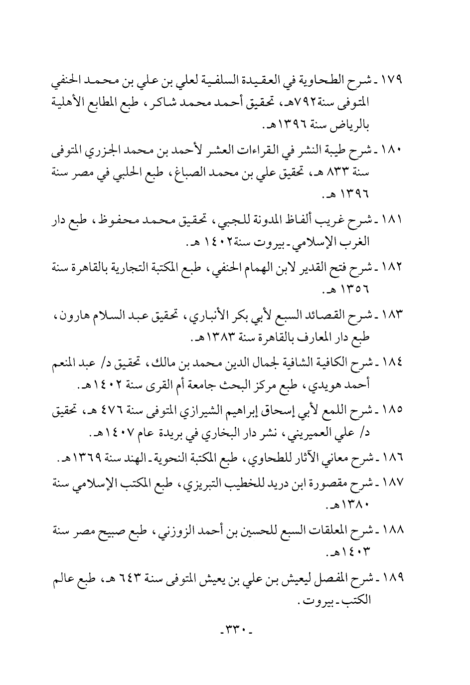 ١٨٠ - شرح طيبة النشر في القراءات العشر لأحمد بن محمد الجزري المتوفى سنة ٨٣٣ هـ، تحقيق علي بن محمد الصباغ، طبع الحلبي في مصر سنة ١٣٩٦ هـ.