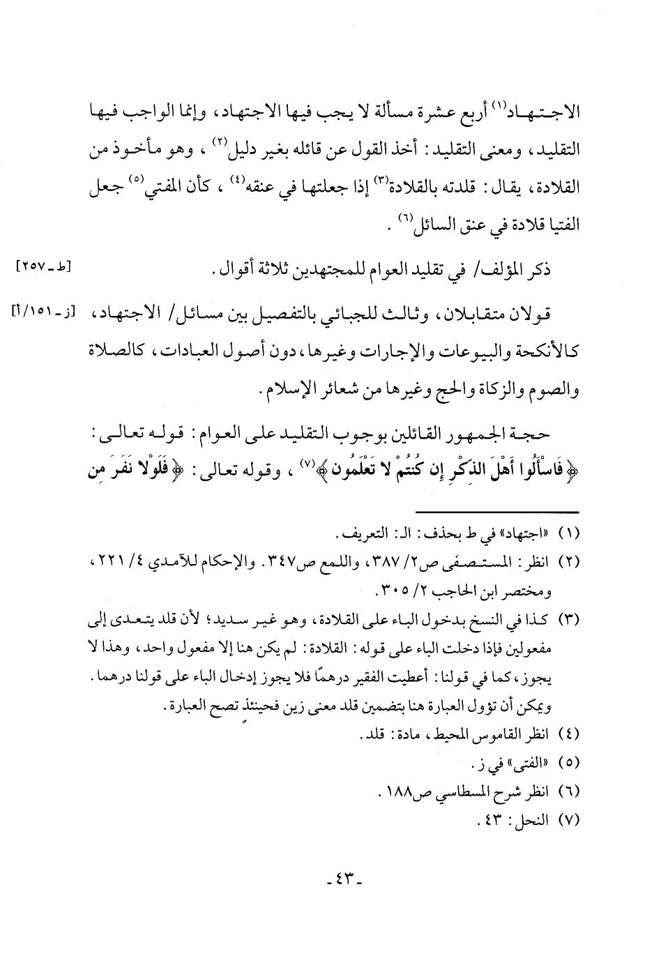 حجة الجمهور القائلين بوجوب التقليد على العوام: قوله تعالى: {فَاسْأَلُوا أَهْلَ الذِّكْرِ إِنْ كُنْتُمْ لَا تَعْلَمُونَ} (٧)، وقوله تعالى: {فَلَوْلَا نَفَرَ مِنْ