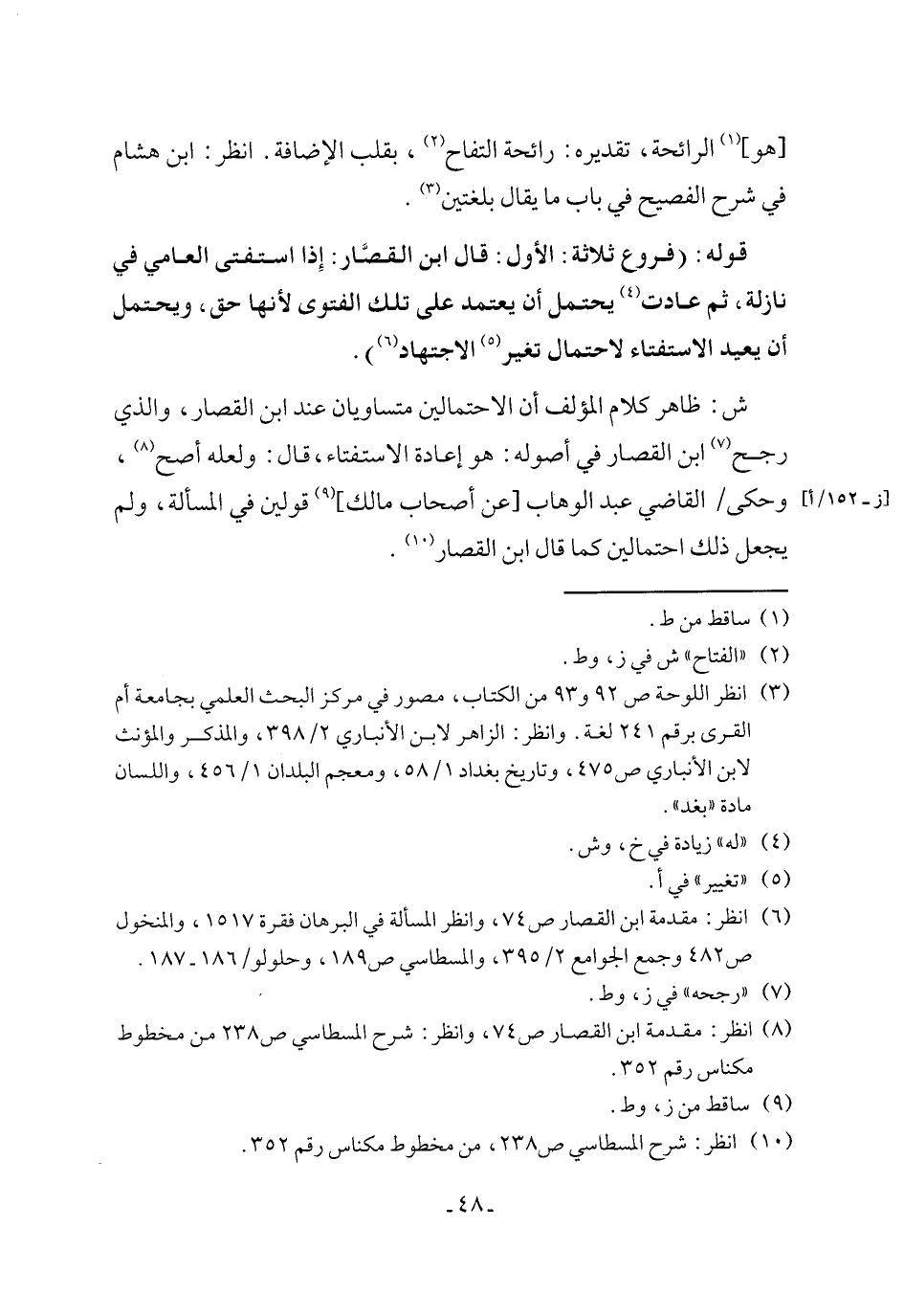 ش: ظاهر كلام المؤلف أن الاحتمالين متساويان عند ابن القصار، والذي رجح (٧) ابن القصار في أصوله: هو إعادة الاستفتاء، قال: ولعله أصح (٨)، وحكى القاضي عبد الوهاب [عن أصحاب مالك] (٩) قولين في المسألة، ولم يجعل ذلك احتمالين كما قال ابن القصار (١٠).