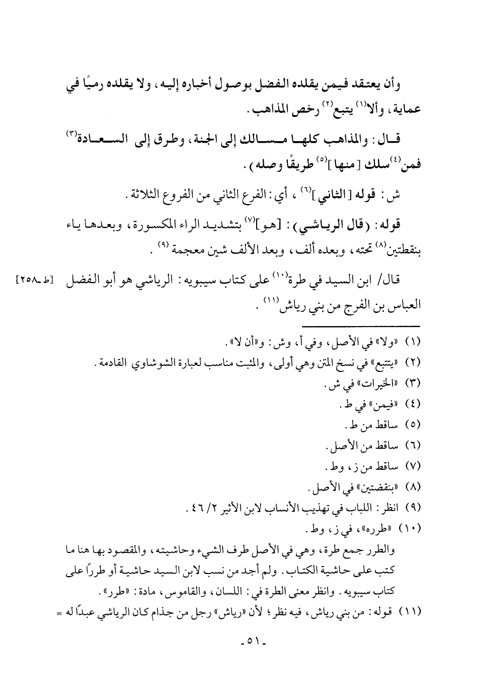 قال ابن السيد في طرة (١٠) على كتاب سيبويه: الرياشي هو أبو الفضل العباس بن الفرج من بني رياش (١١).