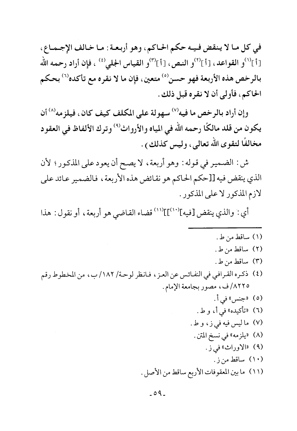 في كل ما لا ينقض فيه حكم الحاكم، وهو أربعة: ما خالف الإِجماع، [أ] (١) والقواعد، [أ] (٢) والنص، [أ] (٣) والقياس الجلي (٤)، فإِن أراد رحمه الله بالرخص هذه الأربعة فهو حسن (٥) متعين، فإِن ما لا نقره مع تأكده (٦) بحكم الحاكم، فأولى أن لا نقره قبل ذلك.