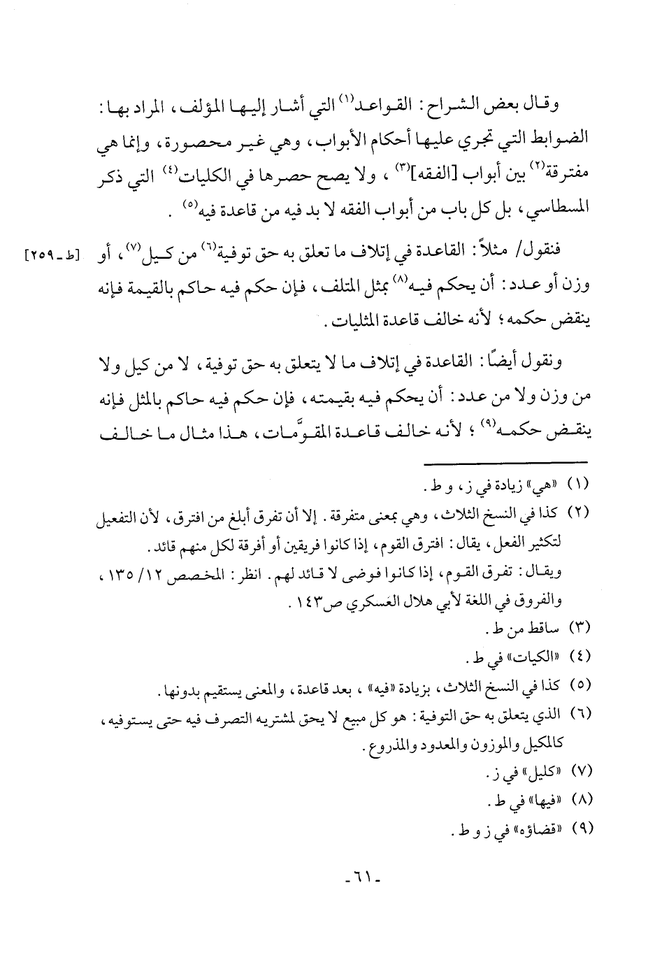 فنقول مثلًا: القاعدة في إتلاف ما تعلق به حق توفية (٦) من كيل (٧)، أو وزن أو عدد: أن يحكم فيه (٨) بمثل المتلف، فإن حكم فيه حاكم بالقيمة فإنه ينقض حكمه؛ لأنه خالف قاعدة المثليات.