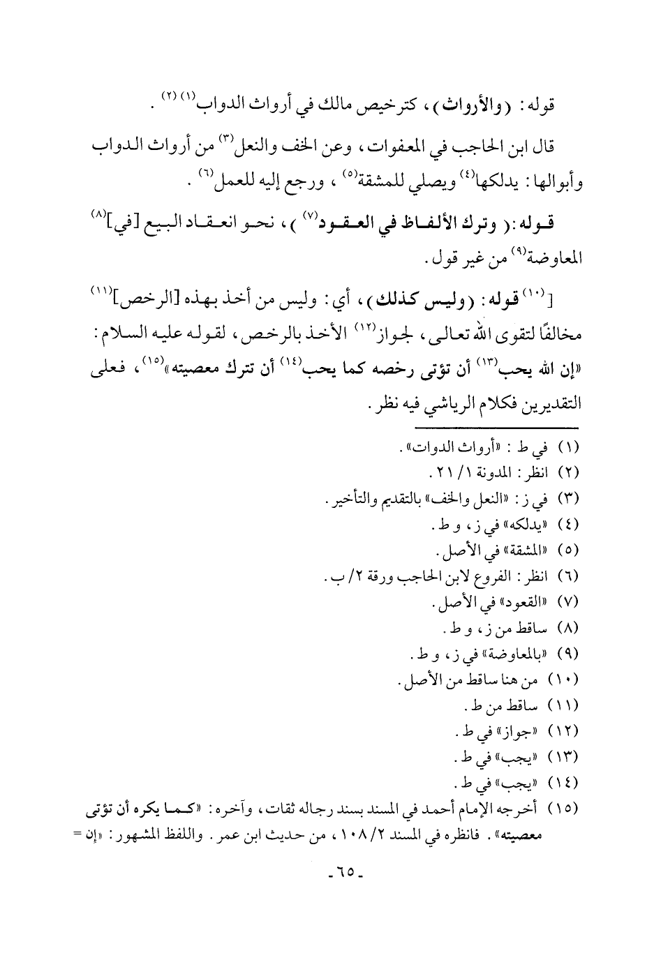 [(١٠) قوله: (وليس كذلك)، أي: وليس من أخذ بهذه [الرخص] (١١) مخالفًا لتقوى الله تعالى، لجواز (١٢) الأخذ بالرخص، لقوله عليه السلام: "إن الله يحب (١٣) أن تؤتى رخصه كما يحب (١٤) أن تترك معصيته" (١٥)، فعلى التقديرين فكلام الرياشي فيه نظر.