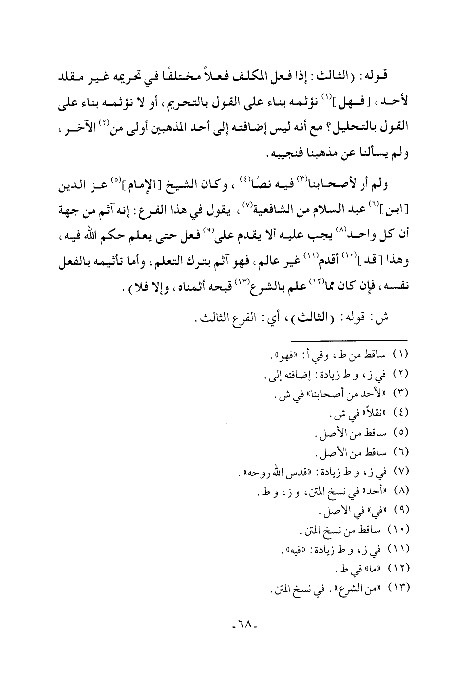 ولم أر لأصحابنا (٣) فيه نصًا (٤)، وكان الشيخ [الإِمام] (٥) عز الدين [ابن] (٦) عبد السلام من الشافعية (٧)، يقول في هذا الفرع: إنه آثم من جهة أن كل واحد (٨) يجب عليه ألا يقدم على (٩) فعل حتى يعلم حكم الله فيه، وهذا [قد] (١٠) أقدم (١١) غير عالم، فهو آثم بترك التعلم، وأما تأثيمه بالفعل نفسه، فإِن كان مما (١٢) علم بالشرع (١٣) قبحه أثمناه، وإِلا فلا).