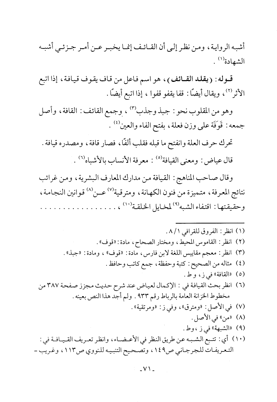 (٦) انظر بحث القيافة في: الإكمال لعياض عند شرح حديث مجزز صفحة ٣٨٧ من مخطوط الخزانة العامة بالرباط رقم ٩٣٣. ولم أجد هذا النص بعينه.