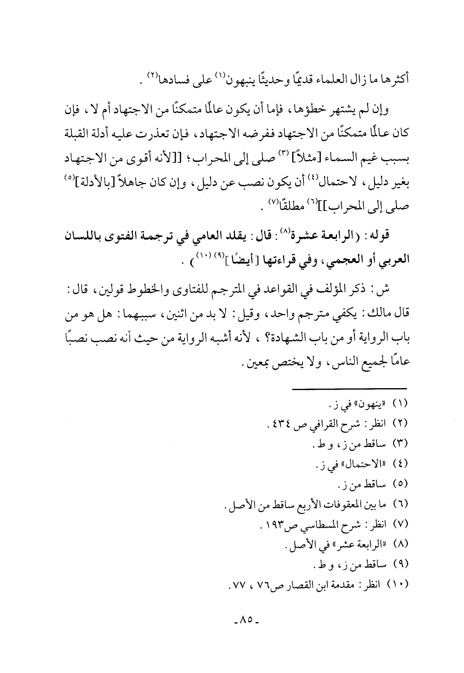 قوله: (الرابعة عشرة (٨): قال: يقلد العامي في ترجمة الفتوى باللسان العربي أو العجمي، وفي قراءتها [أيضًا] (٩) (١٠)).