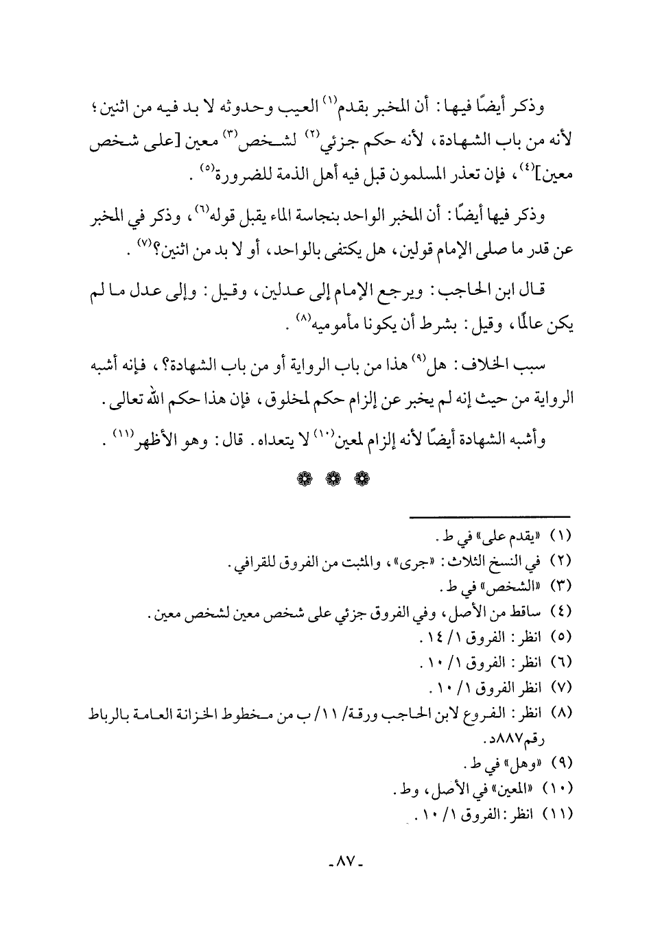 وذكر أيضًا فيها: أن المخبر بقدم (١) العيب وحدوثه لا بد فيه من اثنين؛ لأنه من باب الشهادة، لأنه حكم جزئي (٢) لشخص (٣) معين [على شخص معين] (٤)، فإن تعذر المسلمون قبل فيه أهل الذمة للضرورة (٥).