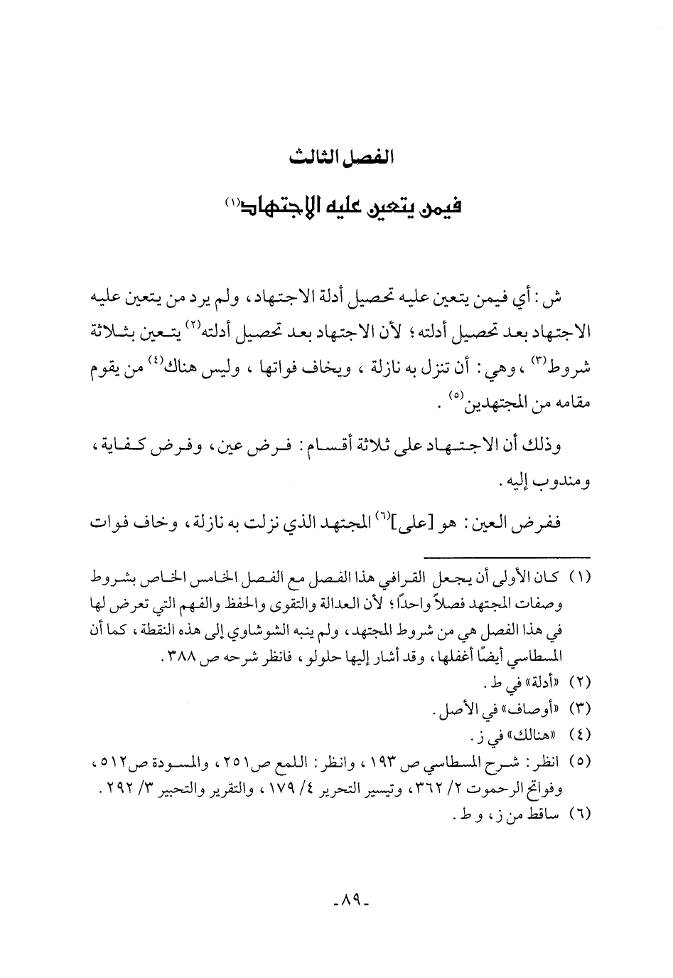 (١) كان الأولى أن يجعل القرافي هذا الفصل مع الفصل الخامس الخاص بشروط وصفات المجتهد فصلاً واحدًا؛ لأن العدالة والتقوى والحفظ والفهم التي تعرض لها في هذا الفصل هي من شروط المجتهد، ولم ينبه الشوشاوي إلى هذه النقطة، كما أن المسطاسي أيضًا أغفلها، وقد أشار إليها حلولو، فانظر شرحه ص ٣٨٨.