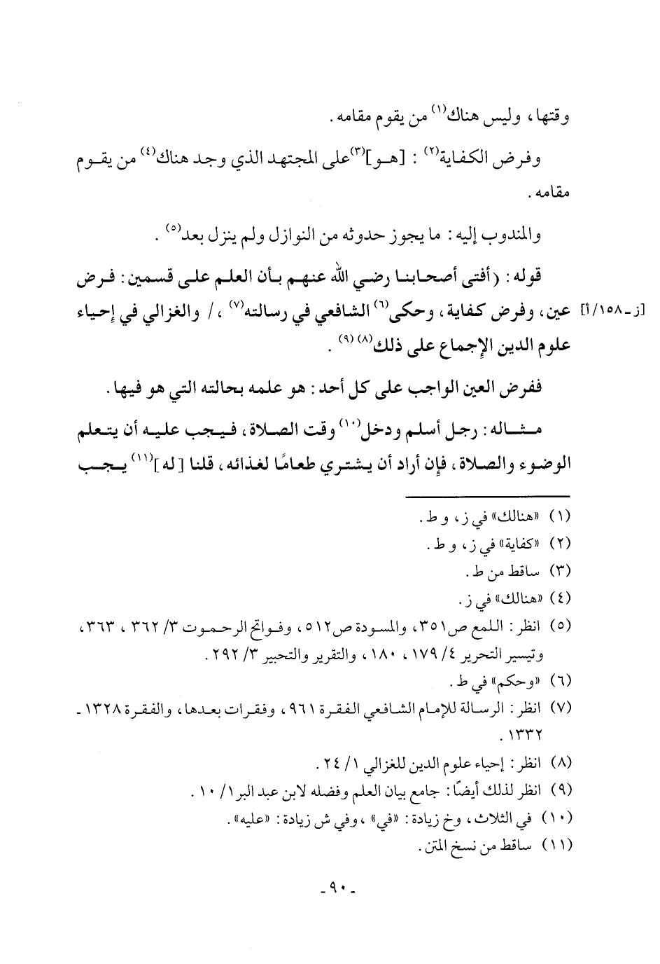 قوله: (أفتى أصحابنا رضي الله عنهم بأن العلم على قسمين: فرض عين، وفرض كفاية، وحكى (٦) الشافعي في رسالته (٧)، والغزالي في إِحياء علوم الدين الإِجماع على ذلك (٨) (٩).