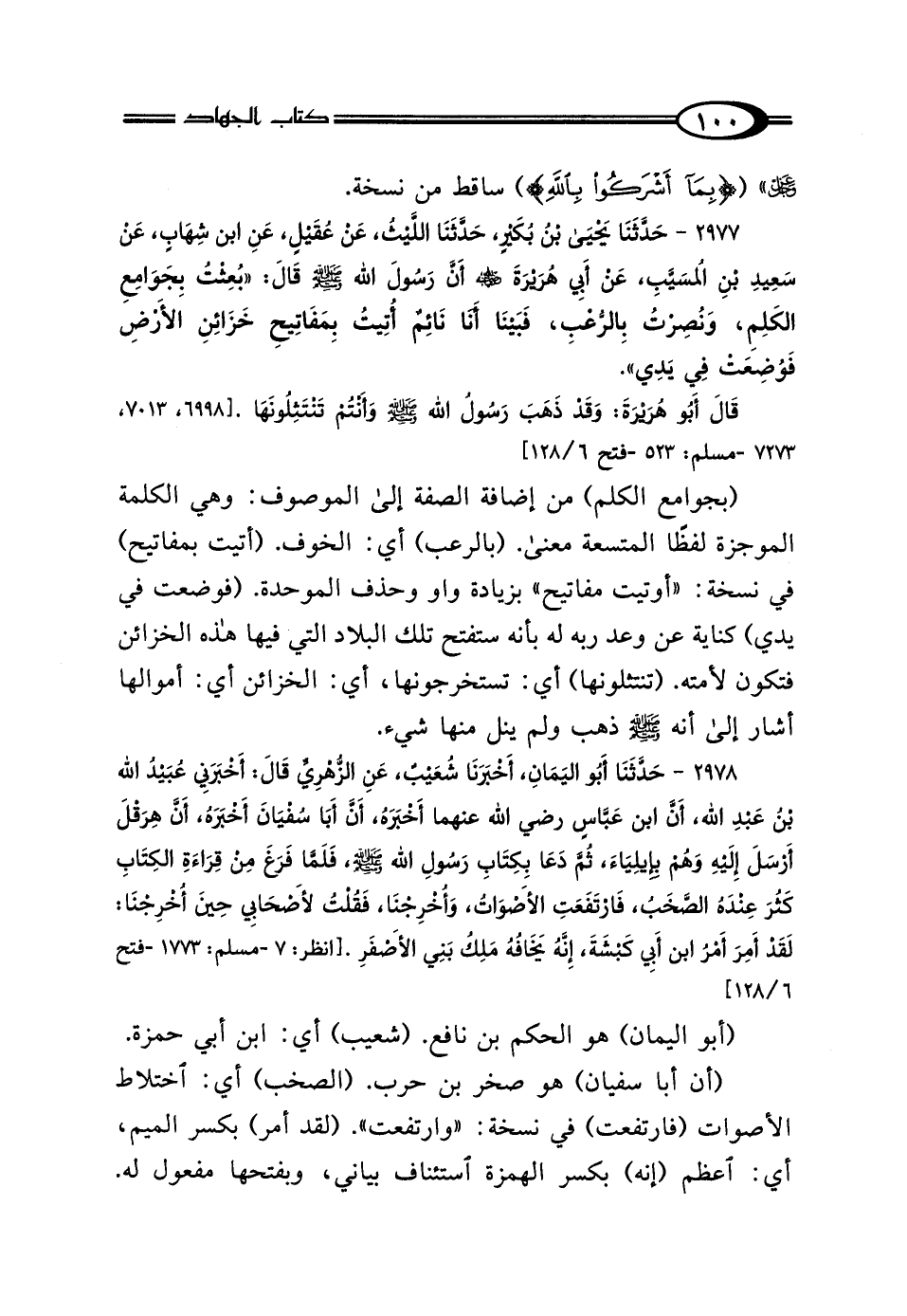 2977 - حَدَّثَنَا يَحْيَى بْنُ بُكَيْرٍ، حَدَّثَنَا اللَّيْثُ، عَنْ عُقَيْلٍ، عَنِ ابْنِ شِهَابٍ، عَنْ سَعِيدِ بْنِ المُسَيِّبِ، عَنْ أَبِي هُرَيْرَةَ رَضِيَ اللَّهُ عَنْهُ: أَنَّ رَسُولَ اللَّهِ صَلَّى اللهُ عَلَيْهِ وَسَلَّمَ قَال: "بُعِثْتُ بِجَوَامِعِ الكَلِمِ، وَنُصِرْتُ بِالرُّعْبِ، فَبَيْنَا أَنَا نَائِمٌ أُتِيتُ بِمَفَاتِيحِ خَزَائِنِ الأَرْضِ، فَوُضِعَتْ فِي يَدِي" قَال أَبُو هُرَيْرَةَ: وَقَدْ ذَهَبَ رَسُولُ اللَّهِ صَلَّى اللهُ عَلَيْهِ وَسَلَّمَ وَأَنْتُمْ تَنْتَثِلُونَهَا.