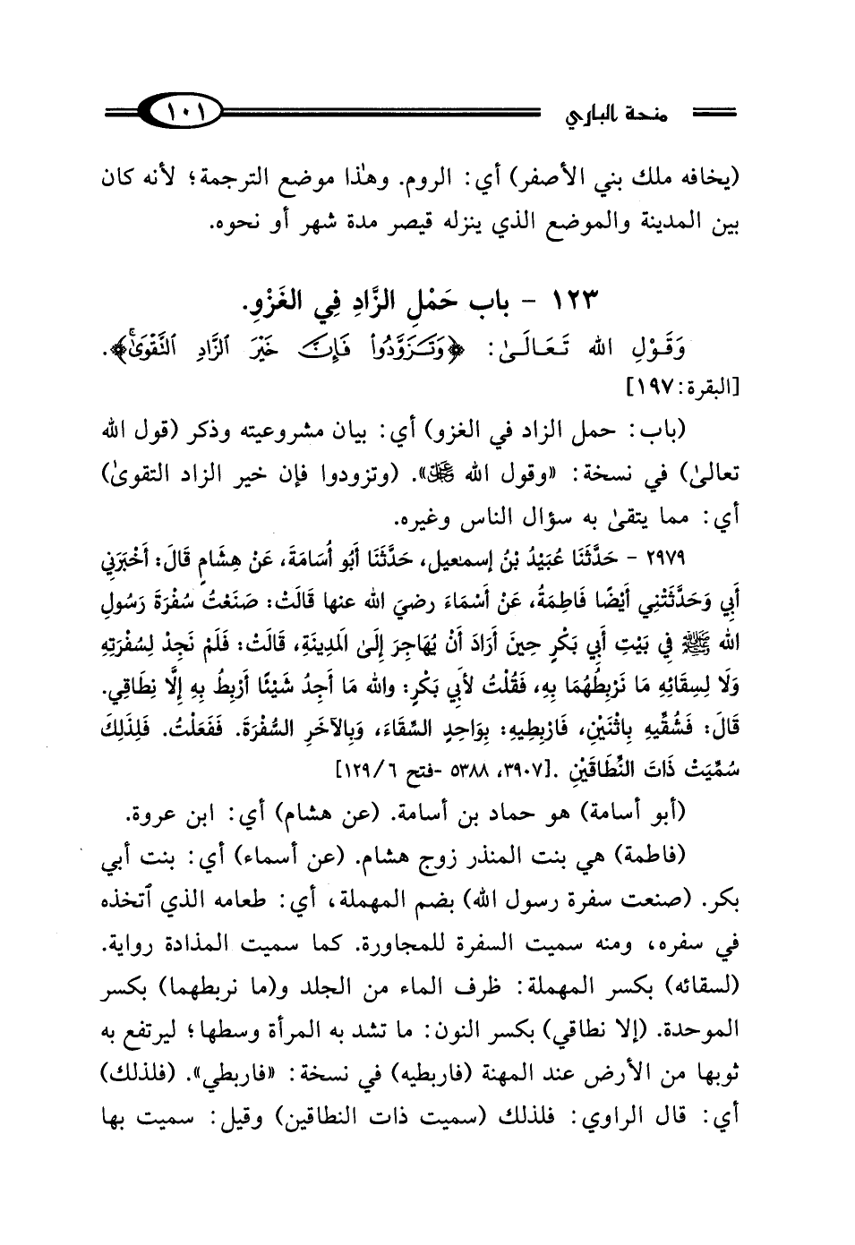 2979 - حَدَّثَنَا عُبَيْدُ بْنُ إِسْمَاعِيلَ، حَدَّثَنَا أَبُو أُسَامَةَ، عَنْ هِشَامٍ، قَال: أَخْبَرَنِي أَبِي، وَحَدَّثَتْنِي أَيْضًا فَاطِمَةُ، عَنْ أَسْمَاءَ رَضِيَ اللَّهُ عَنْهَا، قَالتْ: صَنَعْتُ سُفْرَةَ رَسُولِ اللَّهِ صَلَّى اللهُ عَلَيْهِ وَسَلَّمَ فِي بَيْتِ أَبِي بَكْرٍ، حِينَ أَرَادَ أَنْ يُهَاجِرَ إِلَى المَدِينَةِ، قَالتْ: فَلَمْ نَجِدْ لِسُفْرَتِهِ، وَلَا لِسِقَائِهِ مَا نَرْبِطُهُمَا بِهِ، فَقُلْتُ لِأَبِي بَكْرٍ: "وَاللَّهِ مَا أَجِدُ شَيْئًا أَرْبِطُ بِهِ إلا نِطَاقِي"، قَال: فَشُقِّيهِ بِاثْنَيْنِ، فَارْبِطِيهِ: بِوَاحِدٍ السِّقَاءَ، وَبِالْآخَرِ السُّفْرَةَ، "فَفَعَلْتُ، فَلِذَلِكَ سُمِّيَتْ ذَاتَ النِّطَاقَيْنِ".
