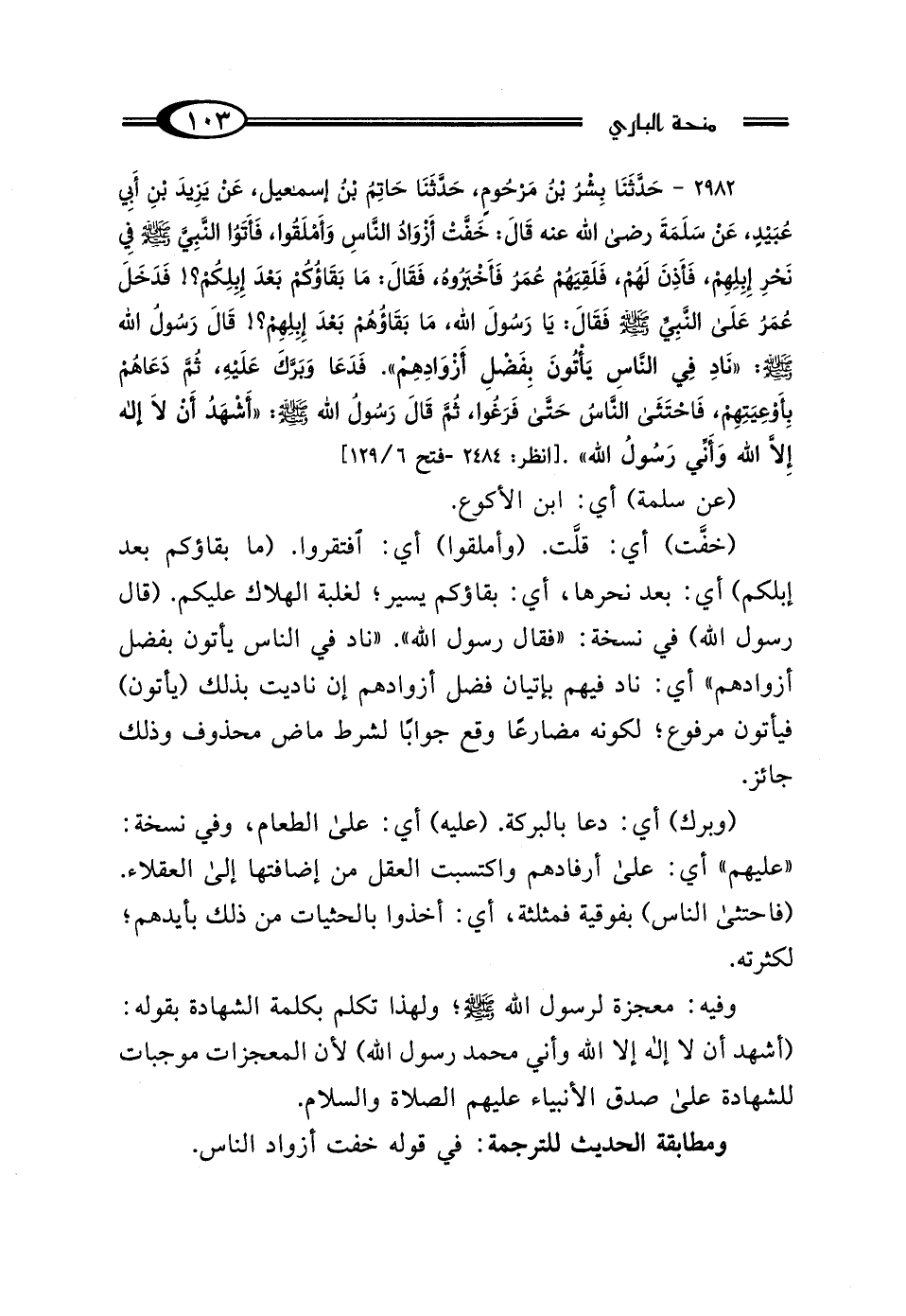 2982 - حَدَّثَنَا بِشْرُ بْنُ مَرْحُومٍ، حَدَّثَنَا حَاتِمُ بْنُ إِسْمَاعِيلَ، عَنْ يَزِيدَ بْنِ أَبِي عُبَيْدٍ، عَنْ سَلَمَةَ رَضِيَ اللَّهُ عَنْهُ، قَال: خَفَّتْ أَزْوَادُ النَّاسِ وَأَمْلَقُوا، فَأَتَوُا النَّبِيَّ صَلَّى اللهُ عَلَيْهِ وَسَلَّمَ، فِي نَحْرِ إِبِلِهِمْ فَأَذِنَ لَهُمْ، فَلَقِيَهُمْ عُمَرُ فَأَخْبَرُوهُ، فَقَال: مَا بَقَاؤُكُمْ بَعْدَ إِبِلِكُمْ؟ فَدَخَلَ عُمَرُ عَلَى النَّبِيِّ صَلَّى اللهُ عَلَيْهِ وَسَلَّمَ، فَقَال: يَا رَسُولَ اللَّهِ، مَا بَقَاؤُهُمْ بَعْدَ إِبِلِهِمْ؟ قَال رَسُولُ اللَّهِ صَلَّى اللهُ عَلَيْهِ وَسَلَّمَ: "نَادِ فِي النَّاسِ يَأْتُونَ بِفَضْلِ أَزْوَادِهِمْ"، فَدَعَا وَبَرَّكَ عَلَيْهِ، ثُمَّ دَعَاهُمْ بِأَوْعِيَتِهِمْ، فَاحْتَثَى النَّاسُ حَتَّى فَرَغُوا، ثُمَّ قَال رَسُولُ اللَّهِ صَلَّى اللهُ عَلَيْهِ وَسَلَّمَ: "أَشْهَدُ أَنْ لَا إِلَهَ إلا اللَّهُ، وَأَنِّي رَسُولُ اللَّهِ".