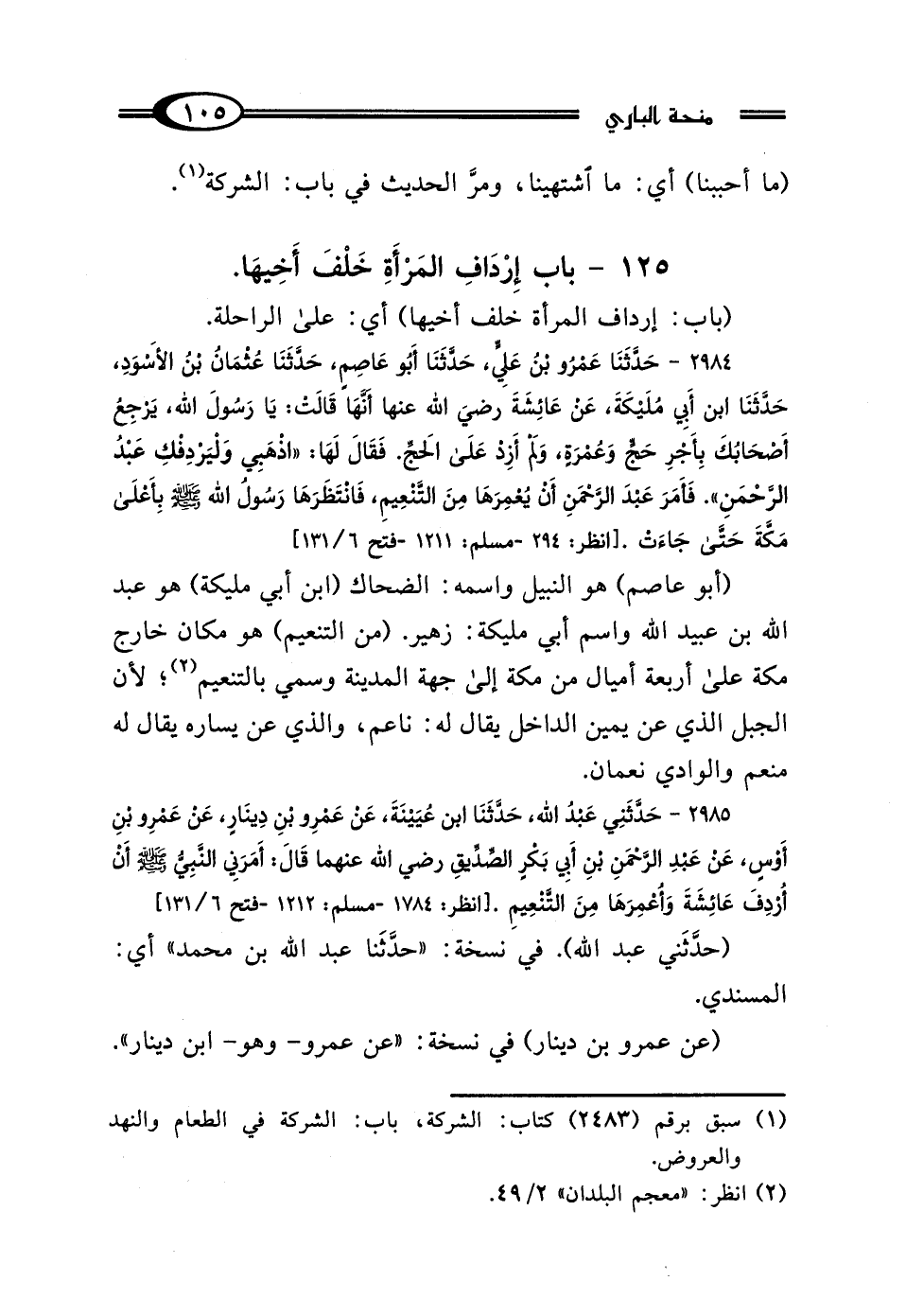 (أبو عاصم) هو النبيل واسمه: الضحاك (ابن أبي مليكة) هو عبد الله بن عبيد الله واسم أبي مليكة: زهير. (من التنعيم) هو مكان خارج مكة على أربعة أميال من مكة إلى جهة المدينة وسمي بالتنعيم (¬2)؛ لأن الجبل الذي عن يمين الداخل يقال له: ناعم، والذي عن يساره يقال له منعم والوادي نعمان.