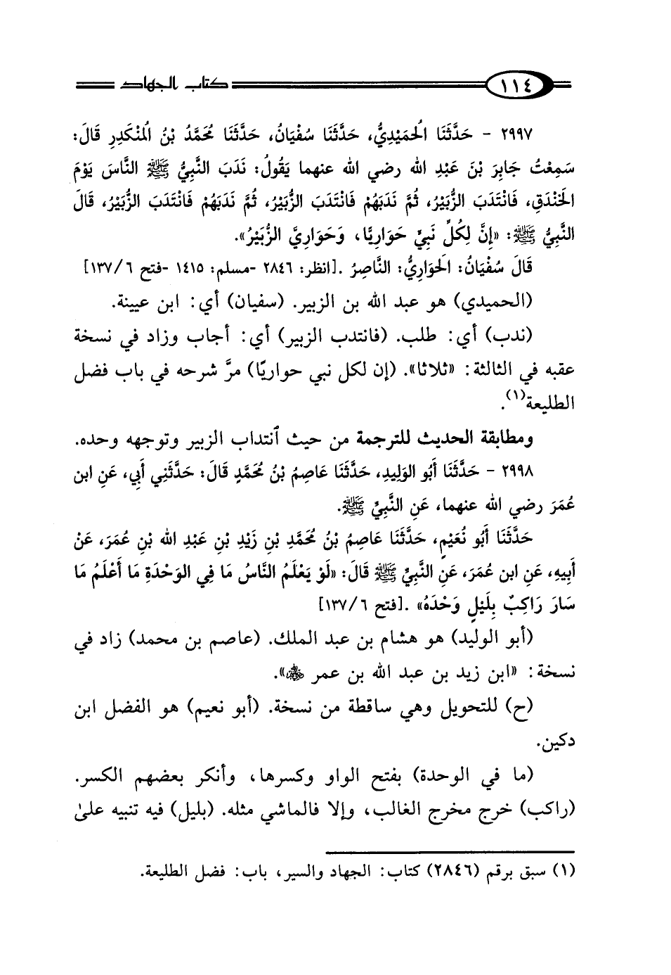 2997 - حَدَّثَنَا الحُمَيْدِيُّ، حَدَّثَنَا سُفْيَانُ، حَدَّثَنَا مُحَمَّدُ بْنُ المُنْكَدِرِ، قَال: سَمِعْتُ جَابِرَ بْنَ عَبْدِ اللَّهِ رَضِيَ اللَّهُ عَنْهُمَا، يَقُولُ: نَدَبَ النَّبِيُّ صَلَّى اللهُ عَلَيْهِ وَسَلَّمَ النَّاسَ يَوْمَ الخَنْدَقِ، فَانْتَدَبَ الزُّبَيْرُ، ثُمَّ نَدَبَهُمْ فَانْتَدَبَ الزُّبَيْرُ، ثُمَّ نَدَبَهُمْ فَانْتَدَبَ الزُّبَيْرُ، قَال النَّبِيُّ صَلَّى اللهُ عَلَيْهِ وَسَلَّمَ: "إِنَّ لِكُلِّ نَبِيٍّ حَوَارِيًّا وَحَوَارِيَّ الزُّبَيْرُ" قَال سُفْيَانُ: الحَوَارِيُّ: النَّاصِرُ.