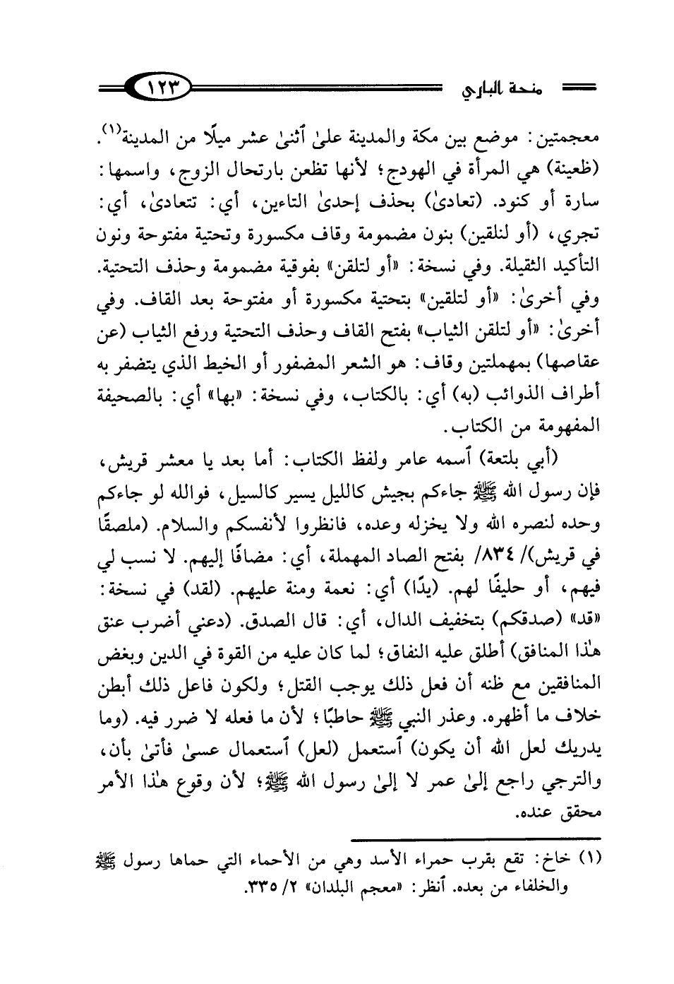 (ظعينة) هي المرأة في الهودج؛ لأنها تظعن بارتحال الزوج، واسمها: سارة أو كنود. (تعادى) بحذف إحدى التاءين، أي: تتعادى، أي: تجري، (أو لنلقين) بنون مضمومة وقاف مكسورة وتحتية مفتوحة ونون التأكيد الثقيلة. وفي نسخة: "أو لتلقن" بفوقية مضمومة وحذف التحتية. وفي أخرى: "أو لتلقين" بتحتية مكسورة أو مفتوحة بعد القاف. وفي أخرى: "أو لتلقن الثياب" بفتح القاف وحذف التحتية ورفع الثياب (عن عقاصها) بمهملتين وقاف: هو الشعر المضفور أو الخيط الذي يتضفر به أطراف الذوائب (به) أي: بالكتاب، وفي نسخة: "بها" أي: بالصحيفة المفهومة من الكتاب.