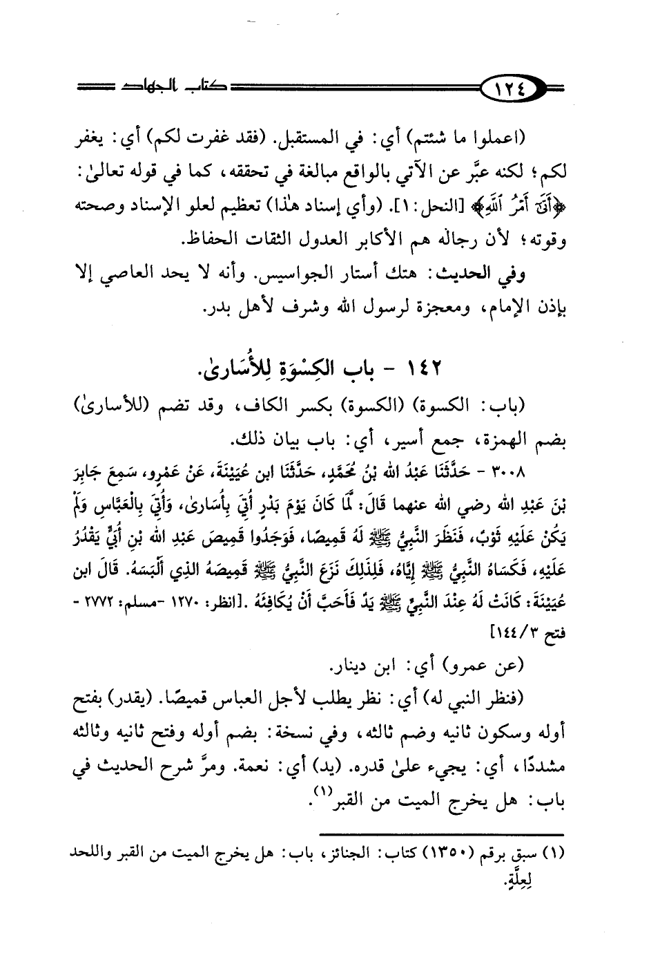 3008 - حَدَّثَنَا عَبْدُ اللَّهِ بْنُ مُحَمَّدٍ، حَدَّثَنَا ابْنُ عُيَيْنَةَ، عَنْ عَمْرٍو، سَمِعَ جَابِرَ بْنَ عَبْدِ اللَّهِ رَضِيَ اللَّهُ عَنْهُمَا، قَال: لَمَّا كَانَ يَوْمَ بَدْرٍ أُتِيَ بِأُسَارَى، وَأُتِيَ بِالعَبَّاسِ وَلَمْ يَكُنْ عَلَيْهِ ثَوْبٌ، "فَنَظَرَ النَّبِيُّ صَلَّى اللهُ عَلَيْهِ وَسَلَّمَ لَهُ قَمِيصًا، فَوَجَدُوا قَمِيصَ عَبْدِ اللَّهِ بْنِ أُبَيٍّ يَقْدُرُ عَلَيْهِ، فَكَسَاهُ النَّبِيُّ صَلَّى اللهُ عَلَيْهِ وَسَلَّمَ إِيَّاهُ، فَلِذَلِكَ نَزَعَ النَّبِيُّ صَلَّى اللهُ عَلَيْهِ وَسَلَّمَ قَمِيصَهُ الَّذِي أَلْبَسَهُ" قَال ابْنُ عُيَيْنَةَ كَانَتْ لَهُ عِنْدَ النَّبِيِّ صَلَّى اللهُ عَلَيْهِ وَسَلَّمَ يَدٌ فَأَحَبَّ أَنْ يُكَافِئَهُ.