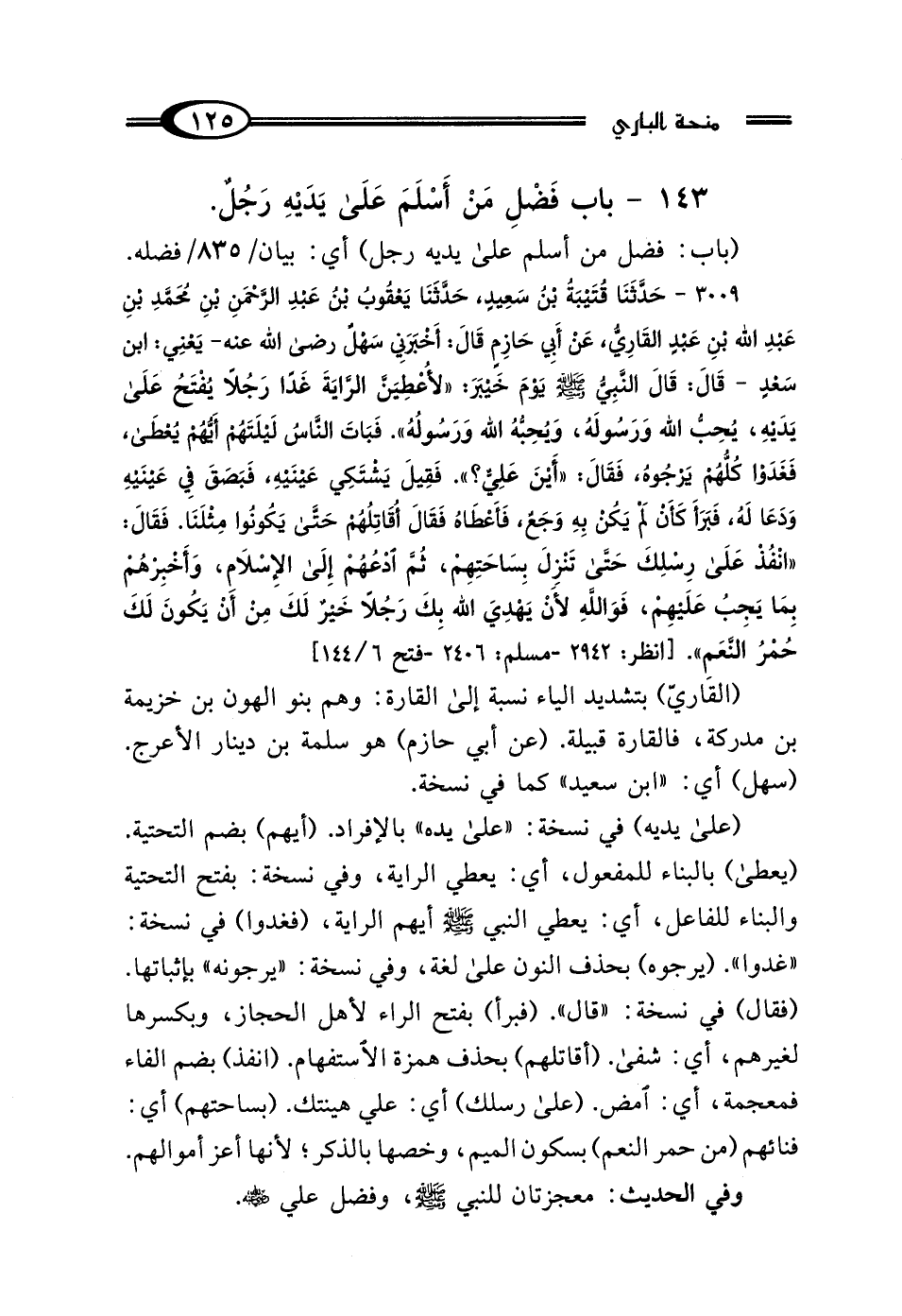 3009 - حَدَّثَنَا قُتَيْبَةُ بْنُ سَعِيدٍ، حَدَّثَنَا يَعْقُوبُ بْنُ عَبْدِ الرَّحْمَنِ بْنِ مُحَمَّدِ بْنِ عَبْدِ اللَّهِ بْنِ عَبْدٍ القَارِيُّ، عَنْ أَبِي حَازِمٍ، قَال: أَخْبَرَنِي سَهْلٌ رَضِيَ اللَّهُ عَنْهُ، يَعْنِي ابْنَ سَعْدٍ، قَال: قَال النَّبِيُّ صَلَّى اللهُ عَلَيْهِ وَسَلَّمَ يَوْمَ خَيْبَرَ: "لَأُعْطِيَنَّ الرَّايَةَ غَدًا رَجُلًا يُفْتَحُ عَلَى يَدَيْهِ، يُحِبُّ اللَّهَ وَرَسُولَهُ، وَيُحِبُّهُ اللَّهُ وَرَسُولُهُ"، فَبَاتَ النَّاسُ لَيْلَتَهُمْ أَيُّهُمْ يُعْطَى، فَغَدَوْا كُلُّهُمْ يَرْجُوهُ، فَقَال: "أَيْنَ عَلِيٌّ؟ "، فَقِيلَ يَشْتَكِي عَيْنَيْهِ، فَبَصَقَ فِي عَيْنَيْهِ وَدَعَا لَهُ، فَبَرَأَ كَأَنْ لَمْ يَكُنْ بِهِ وَجَعٌ، فَأَعْطَاهُ فَقَال: أُقَاتِلُهُمْ حَتَّى يَكُونُوا مِثْلَنَا؟ فَقَال: "انْفُذْ عَلَى رِسْلِكَ حَتَّى تَنْزِلَ بِسَاحَتِهِمْ، ثُمَّ ادْعُهُمْ إِلَى الإِسْلامِ، وَأَخْبِرْهُمْ بِمَا يَجِبُ عَلَيْهِمْ، فَوَاللَّهِ لَأَنْ يَهْدِيَ اللَّهُ بِكَ رَجُلًا خَيْرٌ لَكَ مِنْ أَنْ يَكُونَ لَكَ حُمْرُ النَّعَمِ".