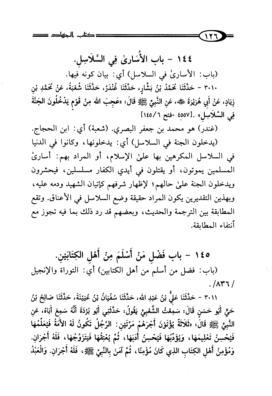 3010 - حَدَّثَنَا مُحَمَّدُ بْنُ بَشَّارٍ، حَدَّثَنَا غُنْدَرٌ، حَدَّثَنَا شُعْبَةُ، عَنْ مُحَمَّدِ بْنِ زِيَادٍ، عَنْ أَبِي هُرَيْرَةَ رَضِيَ اللَّهُ عَنْهُ، عَنِ النَّبِيِّ صَلَّى اللهُ عَلَيْهِ وَسَلَّمَ، قَال: "عَجِبَ اللَّهُ مِنْ قَوْمٍ يَدْخُلُونَ الجَنَّةَ فِي السَّلاسِلِ".
