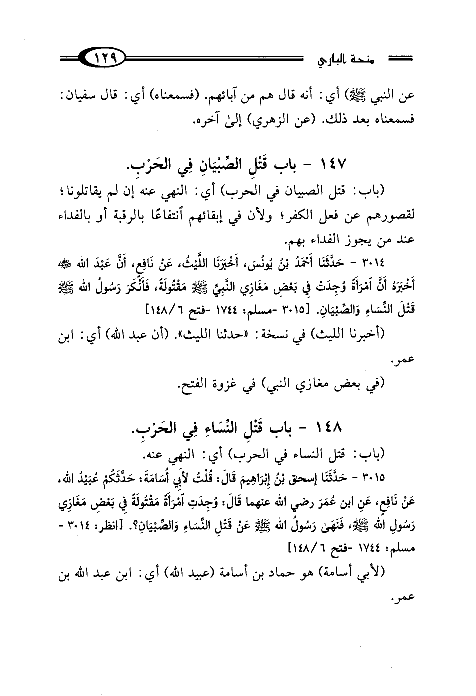 3015 - حَدَّثَنَا إِسْحَاقُ بْنُ إِبْرَاهِيمَ، قَال: قُلْتُ لِأَبِي أُسَامَةَ، حَدَّثَكُمْ عُبَيْدُ اللَّهِ، عَنْ نَافِعٍ، عَنِ ابْنِ عُمَرَ رَضِيَ اللَّهُ عَنْهُمَا، قَال: وُجِدَتِ امْرَأَةٌ مَقْتُولَةً فِي بَعْضِ مَغَازِي رَسُولِ اللَّهِ صَلَّى اللهُ عَلَيْهِ وَسَلَّمَ، "فَنَهَى رَسُولُ اللَّهِ صَلَّى اللهُ عَلَيْهِ وَسَلَّمَ عَنْ قَتْلِ النِّسَاءِ وَالصِّبْيَانِ؟ ".