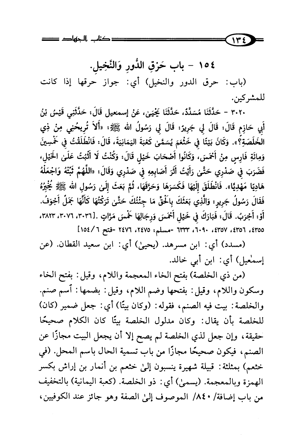 3020 - حَدَّثَنَا مُسَدَّدٌ، حَدَّثَنَا يَحْيَى، عَنْ إِسْمَاعِيلَ، قَال: حَدَّثَنِي قَيْسُ بْنُ أَبِي حَازِمٍ، قَال: قَال لِي جَرِيرٌ: قَال لِي رَسُولُ اللَّهِ صَلَّى اللهُ عَلَيْهِ وَسَلَّمَ: "أَلا تُرِيحُنِي مِنْ ذِي الخَلَصَةِ" وَكَانَ بَيْتًا فِي خَثْعَمَ يُسَمَّى كَعْبَةَ اليَمَانِيَةِ، قَال: فَانْطَلَقْتُ فِي خَمْسِينَ وَمِائَةِ فَارِسٍ مِنْ أَحْمَسَ، وَكَانُوا أَصْحَابَ خَيْلٍ، قَال: وَكُنْتُ لَا أَثْبُتُ عَلَى الخَيْلِ، فَضَرَبَ فِي صَدْرِي حَتَّى رَأَيْتُ أَثَرَ أَصَابِعِهِ فِي صَدْرِي، وَقَال: "اللَّهُمَّ ثَبِّتْهُ، وَاجْعَلْهُ هَادِيًا مَهْدِيًّا"، فَانْطَلَقَ إِلَيْهَا فَكَسَرَهَا وَحَرَّقَهَا، ثُمَّ بَعَثَ إِلَى رَسُولِ اللَّهِ صَلَّى اللهُ عَلَيْهِ وَسَلَّمَ يُخْبِرُهُ، فَقَال رَسُولُ جَرِيرٍ: وَالَّذِي بَعَثَكَ بِالحَقِّ، مَا جِئْتُكَ حَتَّى تَرَكْتُهَا كَأَنَّهَا جَمَلٌ أَجْوَفُ أَوْ أَجْرَبُ، قَال: فَبَارَكَ فِي خَيْلِ أَحْمَسَ، وَرِجَالِهَا خَمْسَ مَرَّاتٍ.