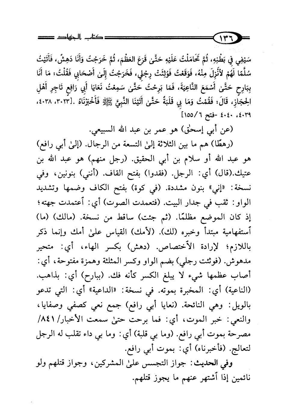 (رهطًا) هم ما بين الثلاثة إلى التسعة من الرجال. (إلى أبي رافع) هو عبد الله أو سلام بن أبي الحقيق. (رجل منهم) هو عبد الله بن عتيك. (قال) أي: الرجل. (فقدوا) بفتح القاف. (أنني) بنونين، وفي نسخة: "إني" بنون مشددة. (في كوة) بفتح الكاف وضمها وتشديد الواو: ثقب في جدار البيت. (فتعمدت الصوت) أي: اعتمدت جهته؛ إذ كان الموضع مظلمًا. (ثم جئت) ساقط من نسخة. (مالك) (ما) استفهامية مبتدأ وخبره (لك). (لأمك) القياس على أمك وإنما ذكر باللازم؛ لإرادة الاختصاص. (دهش) بكسر الهاء، أي: متحير مدهوش. (فوثئت رجلي) بضم الواو وكسر المثلثة وهمزة مفتوحة، أي: أصاب عظمها شيء لا يبلغ الكسر كأنه فك. (ببارح) أي: بذاهب. (الناعية) أي: المخبرة بموته. في نسخة: "الداعية" أي: التي تدعو بالويل: وهي النائحة. (نعايا أبي رافع) جمع نعي كصفي وصفايا، والنعي: خبر الموت، أي: فما برحت حتى سمعت الأخبار مصرحة بموت أبي رافع. (وما بي قلبة) أي: وما بي داء تقلب له الرجل لتعالج. (فأخبرناه) أي: بموت أبي رافع.