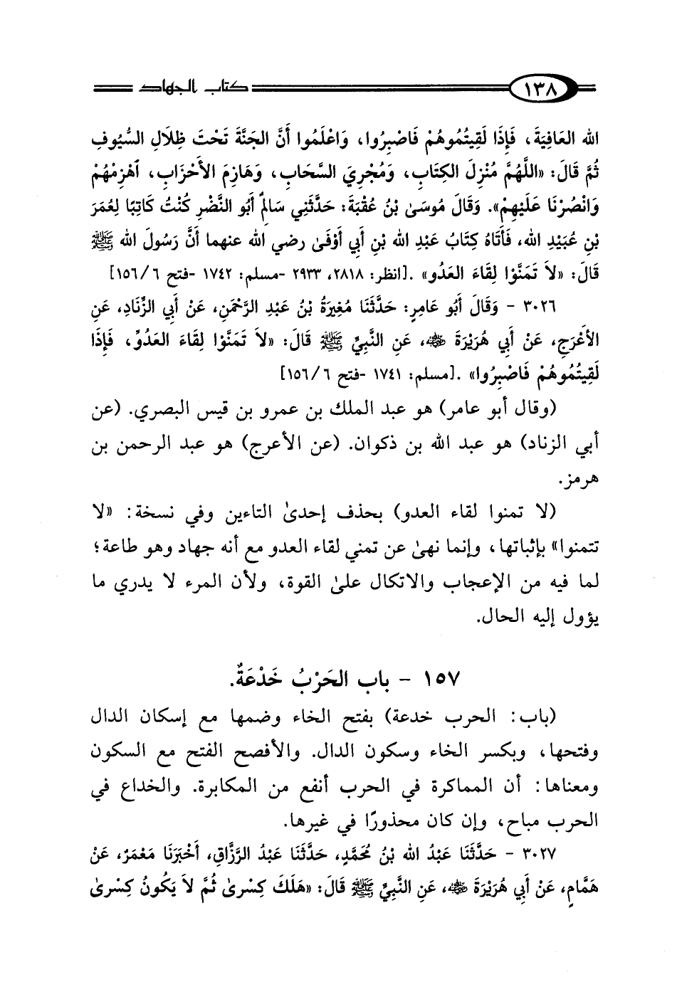 3026 - وَقَال أَبُو عَامِرٍ: حَدَّثَنَا مُغِيرَةُ بْنُ عَبْدِ الرَّحْمَنِ، عَنْ أَبِي الزِّنَادِ، عَنِ الأَعْرَجِ، عَنْ أَبِي هُرَيْرَةَ رَضِيَ اللَّهُ عَنْهُ، عَنِ النَّبِيِّ صَلَّى اللهُ عَلَيْهِ وَسَلَّمَ، قَال: "لَا تَمَنَّوْا لِقَاءَ العَدُوِّ، فَإِذَا لَقِيتُمُوهُمْ فَاصْبِرُوا".