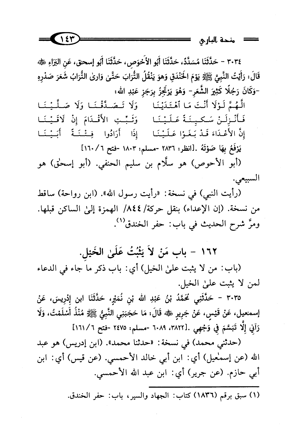 3034 - حَدَّثَنَا مُسَدَّدٌ، حَدَّثَنَا أَبُو الأَحْوَصِ، حَدَّثَنَا أَبُو إِسْحَاقَ، عَنِ البَرَاءِ رَضِيَ اللَّهُ عَنْهُ، قَال: رَأَيْتُ النَّبِيَّ صَلَّى اللهُ عَلَيْهِ وَسَلَّمَ يَوْمَ الخَنْدَقِ وَهُوَ يَنْقُلُ التُّرَابَ حَتَّى وَارَى التُّرَابُ شَعَرَ صَدْرِهِ، وَكَانَ رَجُلًا كَثِيرَ الشَّعَرِ، وَهُوَ يَرْتَجِزُ بِرَجَزِ عَبْدِ اللَّهِ: