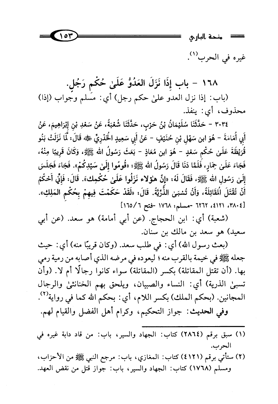 168 - بَابُ إِذَا نَزَلَ العَدُوُّ عَلَى حُكْمِ رَجُلٍ
