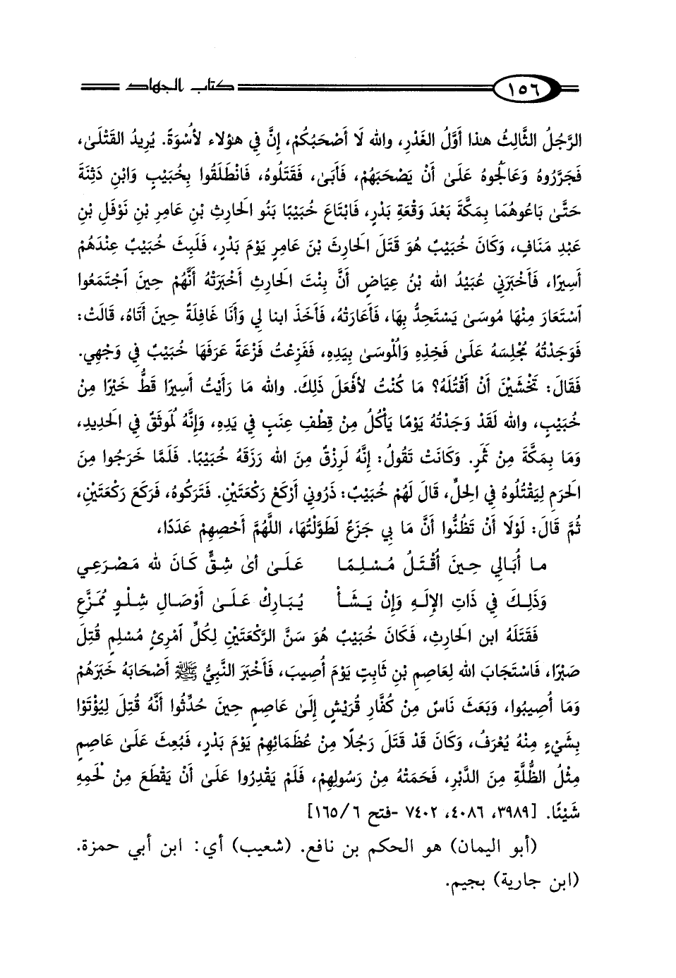 الرَّجُلُ الثَّالِثُ: هَذَا أَوَّلُ الغَدْرِ، وَاللَّهِ لَا أَصْحَبُكُمْ إِنَّ لِي فِي هَؤُلاءِ لَأُسْوَةً يُرِيدُ القَتْلَى، فَجَرَّرُوهُ وَعَالجُوهُ عَلَى أَنْ يَصْحَبَهُمْ فَأَبَى فَقَتَلُوهُ، فَانْطَلَقُوا بِخُبَيْبٍ، وَابْنِ دَثِنَةَ حَتَّى بَاعُوهُمَا بِمَكَّةَ بَعْدَ وَقْعَةِ بَدْرٍ، فَابْتَاعَ خُبَيْبًا بَنُو الحَارِثِ بْنِ عَامِرِ بْنِ نَوْفَلِ بْنِ عَبْدِ مَنَافٍ، وَكَانَ خُبَيْبٌ هُوَ قَتَلَ الحَارِثَ بْنَ عَامِرٍ يَوْمَ بَدْرٍ، فَلَبِثَ خُبَيْبٌ عِنْدَهُمْ أَسِيرًا، فَأَخْبَرَنِي عُبَيْدُ اللَّهِ بْنُ عِيَاضٍ، أَنَّ بِنْتَ الحَارِثِ أَخْبَرَتْهُ: أَنَّهُمْ حِينَ اجْتَمَعُوا اسْتَعَارَ مِنْهَا مُوسَى يَسْتَحِدُّ بِهَا، فَأَعَارَتْهُ، فَأَخَذَ ابْنًا لِي وَأَنَا غَافِلَةٌ حِينَ أَتَاهُ قَالتْ: فَوَجَدْتُهُ مُجْلِسَهُ عَلَى فَخِذِهِ وَالمُوسَى بِيَدِهِ، فَفَزِعْتُ فَزْعَةً عَرَفَهَا خُبَيْبٌ فِي وَجْهِي، فَقَال: تَخْشَيْنَ أَنْ أَقْتُلَهُ؟ مَا كُنْتُ لِأَفْعَلَ ذَلِكَ، وَاللَّهِ مَا رَأَيْتُ أَسِيرًا قَطُّ خَيْرًا مِنْ خُبَيْبٍ، وَاللَّهِ لَقَدْ وَجَدْتُهُ يَوْمًا يَأْكُلُ مِنْ قِطْفِ عِنَبٍ فِي يَدِهِ، وَإِنَّهُ لَمُوثَقٌ فِي الحَدِيدِ، وَمَا بِمَكَّةَ مِنْ ثَمَرٍ، وَكَانَتْ تَقُولُ: إِنَّهُ لَرِزْقٌ مِنَ اللَّهِ رَزَقَهُ خُبَيْبًا، فَلَمَّا خَرَجُوا مِنَ الحَرَمِ لِيَقْتُلُوهُ فِي الحِلِّ، قَال لَهُمْ خُبَيْبٌ: ذَرُونِي أَرْكَعْ رَكْعَتَيْنِ، فَتَرَكُوهُ، فَرَكَعَ رَكْعَتَيْنِ، ثُمَّ قَال: لَوْلَا أَنْ تَظُنُّوا أَنَّ مَا بِي جَزَعٌ لَطَوَّلْتُهَا، اللَّهُمَّ أَحْصِهِمْ عَدَدًا،
