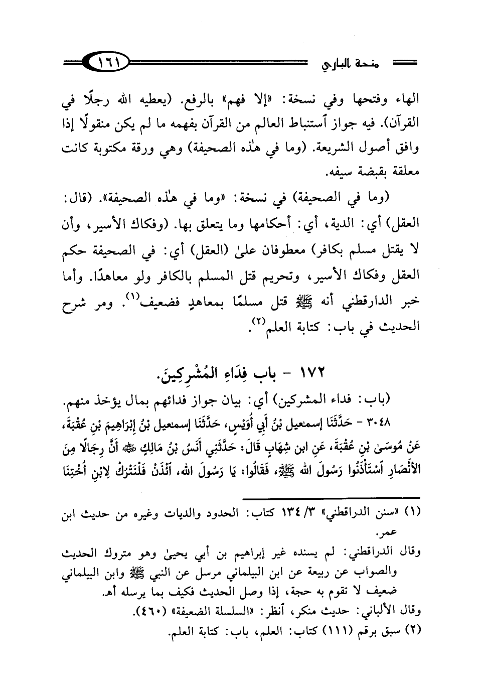 (وما في الصحيفة) في نسخة: "وما في هذه الصحيفة". (قال: العقل) أي: الدية، أي: أحكامها وما يتعلق بها. (وفكاك الأسير، وأن لا يقتل مسلم بكافر) معطوفان على (العقل) أي: في الصحيفة حكم العقل وفكاك الأسير، وتحريم قتل المسلم بالكافر ولو معاهدًا. وأما خبر الدارقطني أنه - صلى الله عليه وسلم - قتل مسلمًا بمعاهدٍ فضعيف (¬1). ومر شرح الحديث في باب: كتابة العلم (¬2).