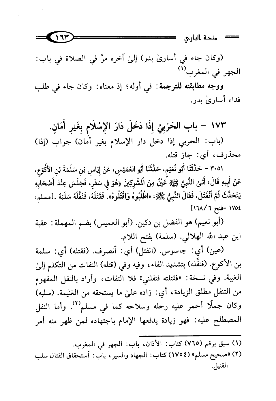 (عين) أي: جاسوس. (انفتل) أي: انصرف. (فقتله) أي: سلمة بن الأكوع. (فنفَّله) بتشديد الفاء، وفيه وفي (قتله) التفات من التكلم إلى الغيبة. وفي نسخة: "فقتلته فنفلني" فلا التفات، وأراد بالنفل المفهوم من التنفل مطلق الزيادة، أي: زاده على ما يستحقه من الغنيمة. (سلبه) وكان جملًا أحمر عليه رحله وسلاحه كما في مسلم (¬2). وأما النفل المصطلح عليه: فهو زيادة يدفعها الإمام باجتهاده لمن ظهر منه أمر